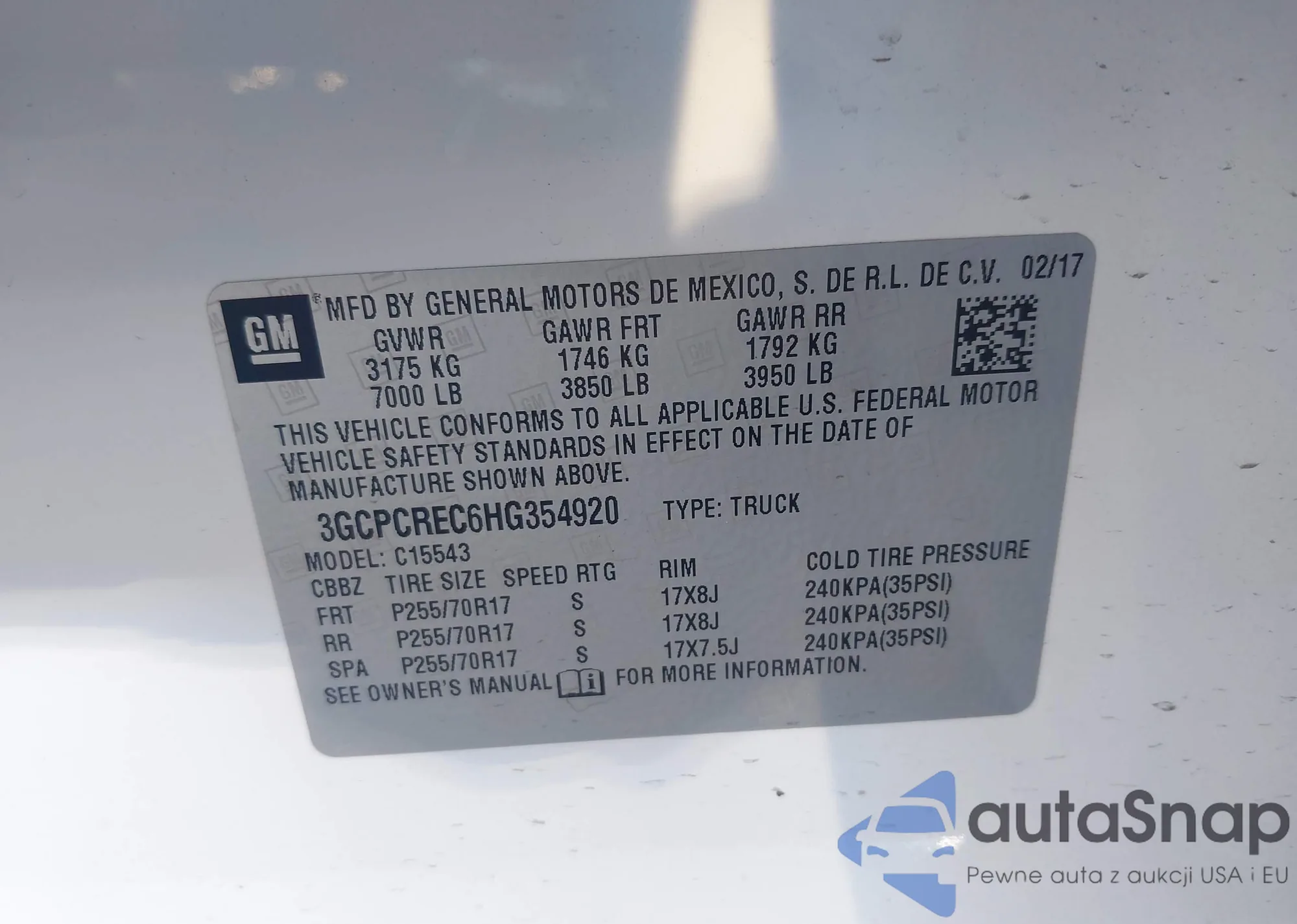 • VIN 3GCPCREC6HG354920