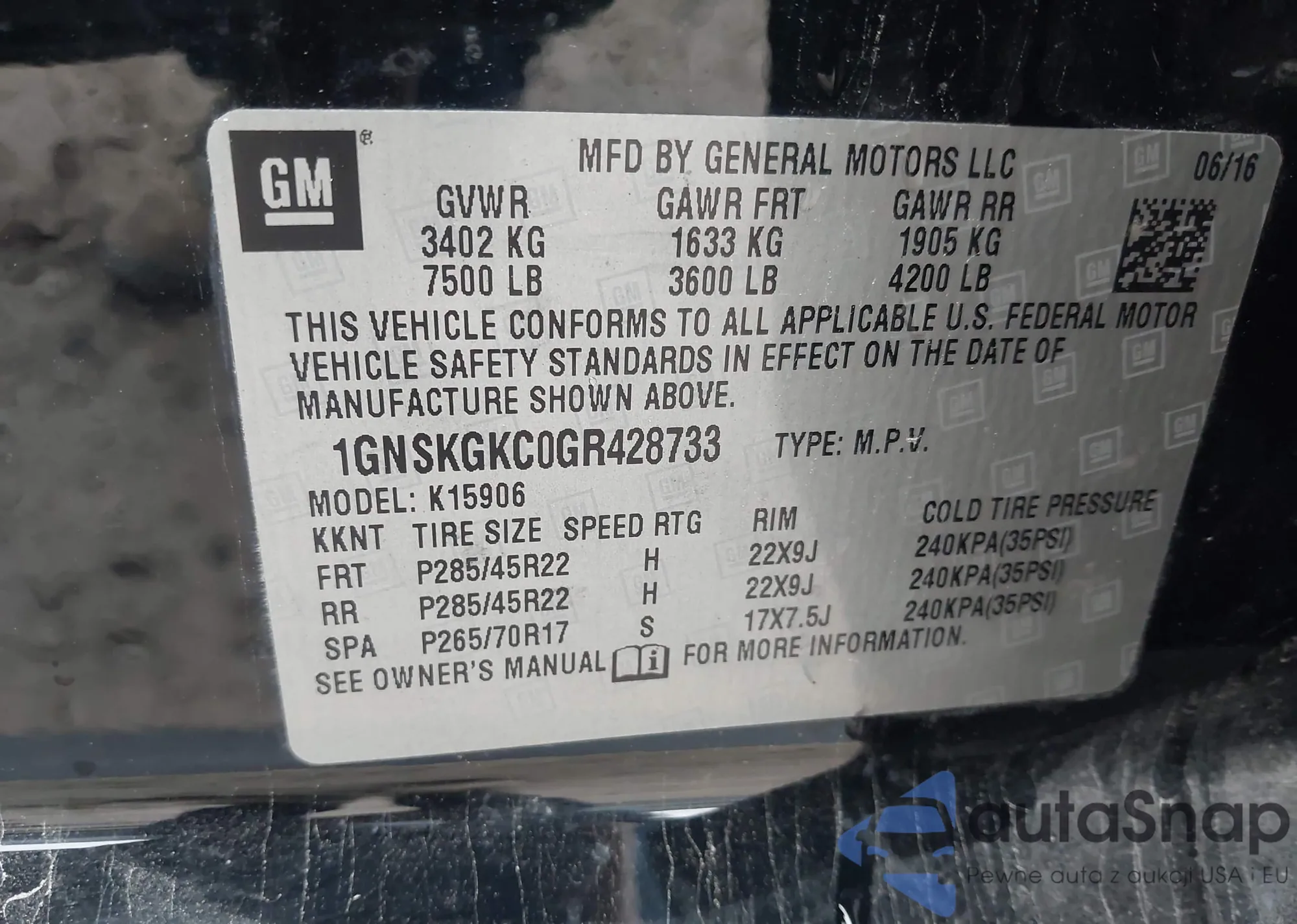 LOT: 43729901 VIN: 1GNSKGKC0GR428733