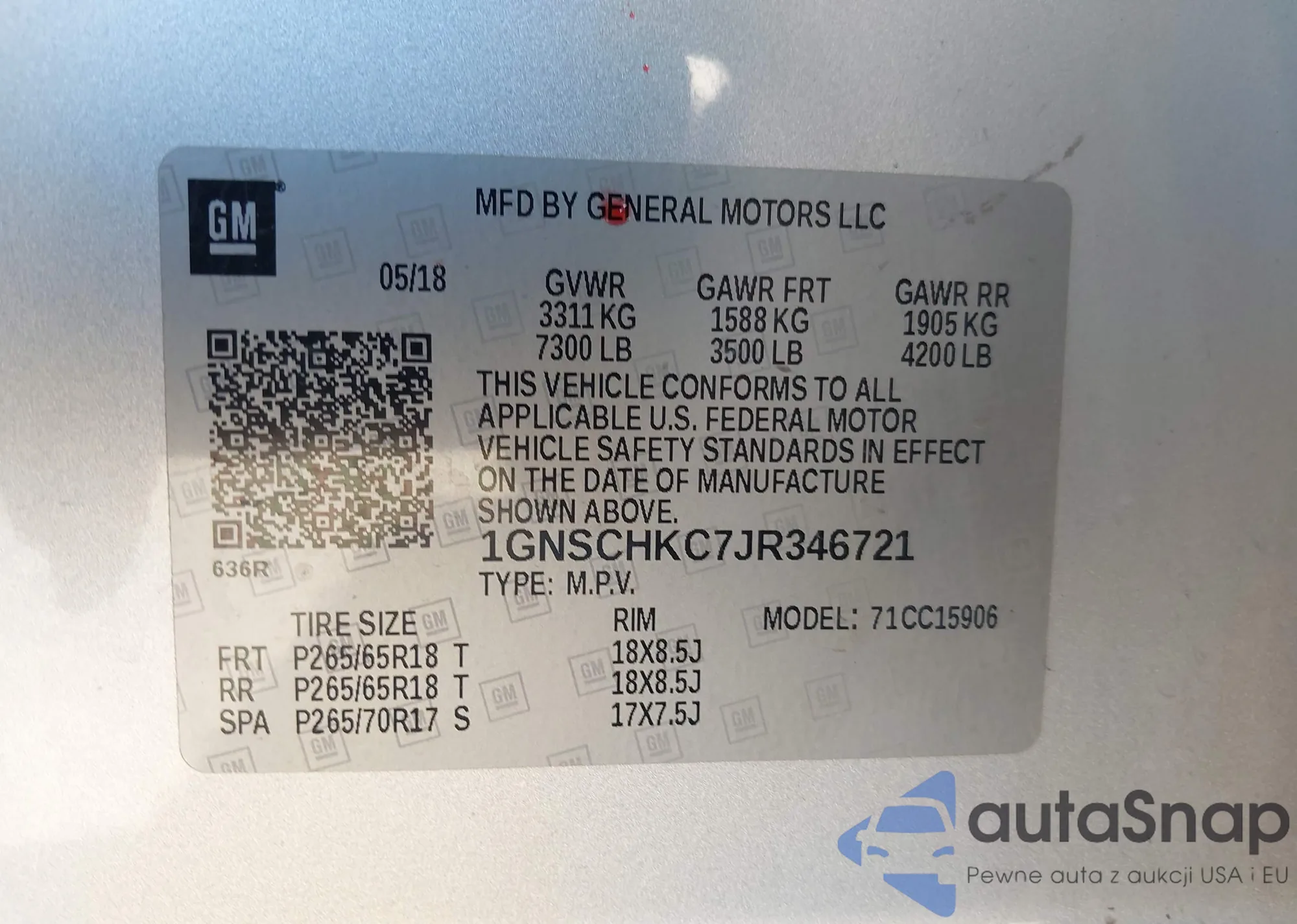 LOT: 43762276 VIN: 1GNSCHKC7JR346721