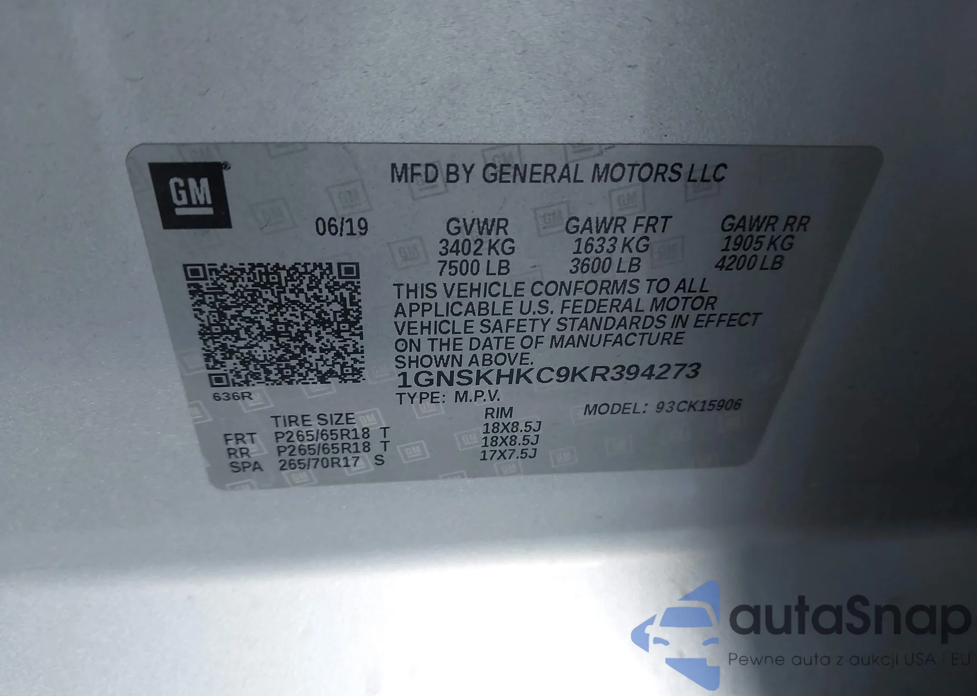 LOT: 44128138 VIN: 1GNSKHKCXKR406561
