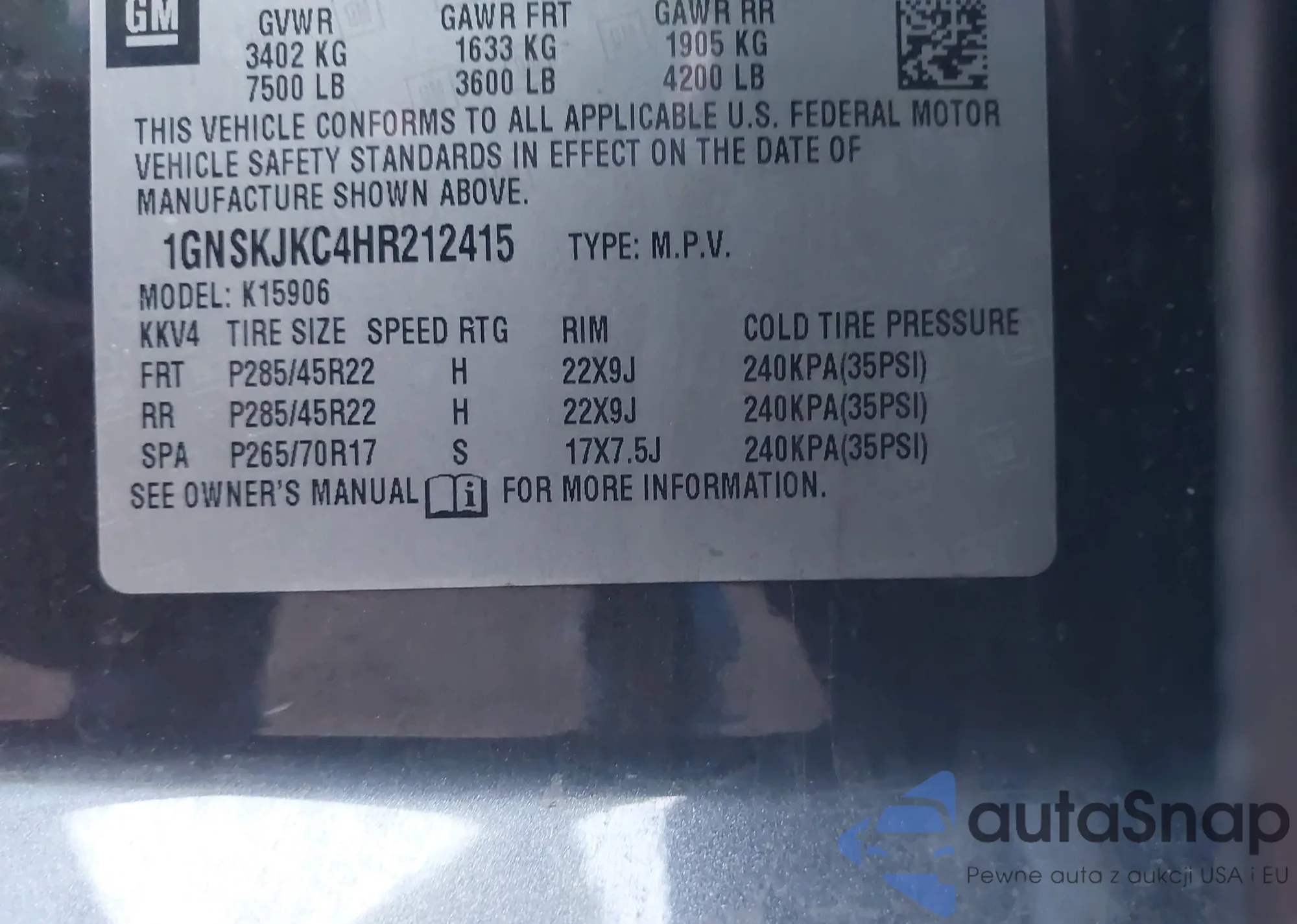 • VIN 1GNSKJKC4HR212415