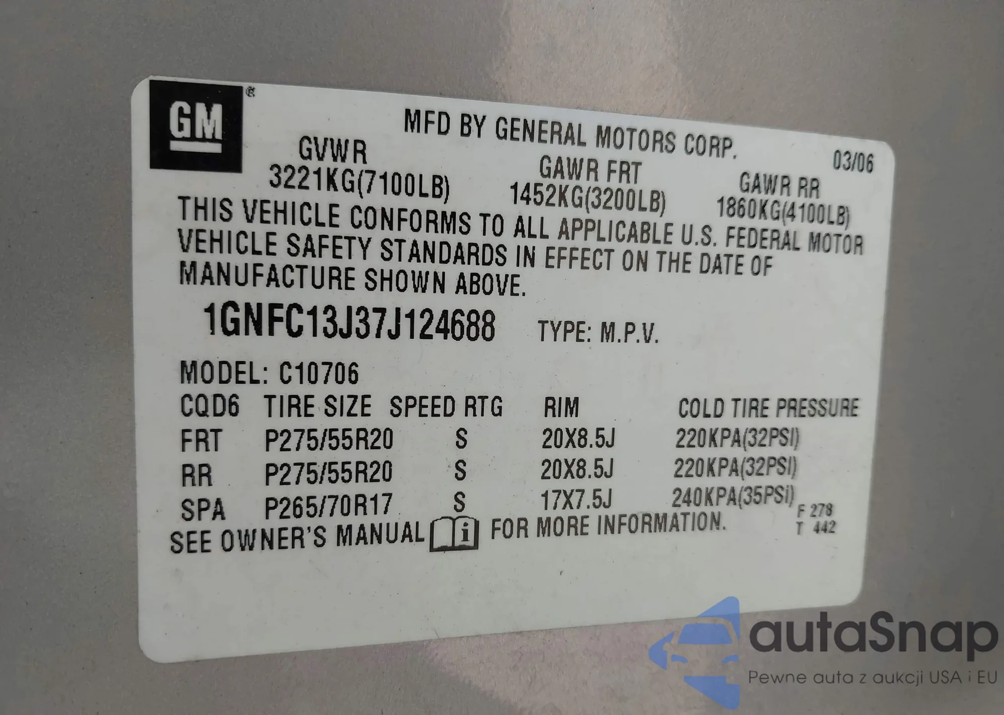 LOT: 43708364 VIN: 1GNFC13J37J124688