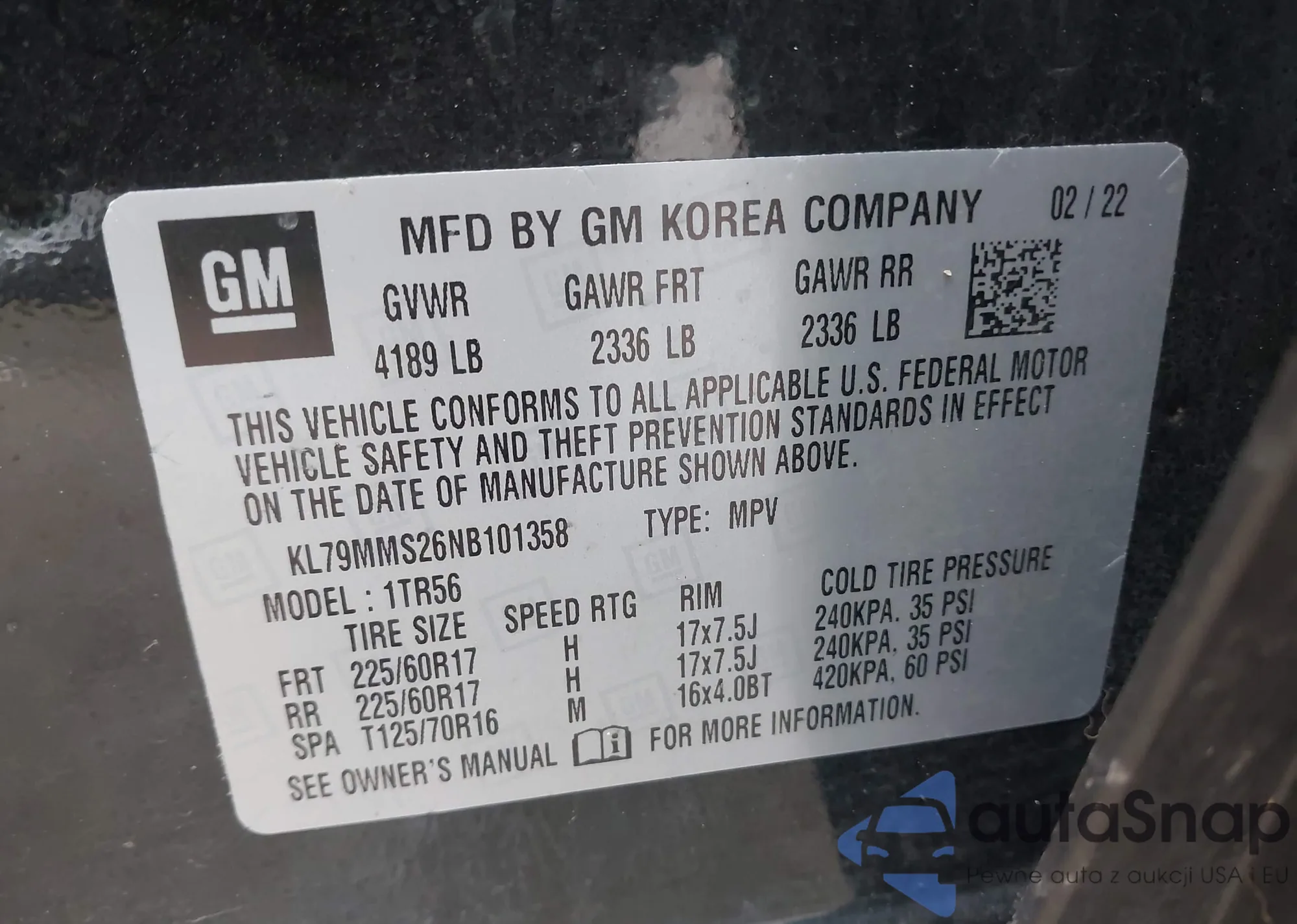 • VIN KL79MMS26NB101358