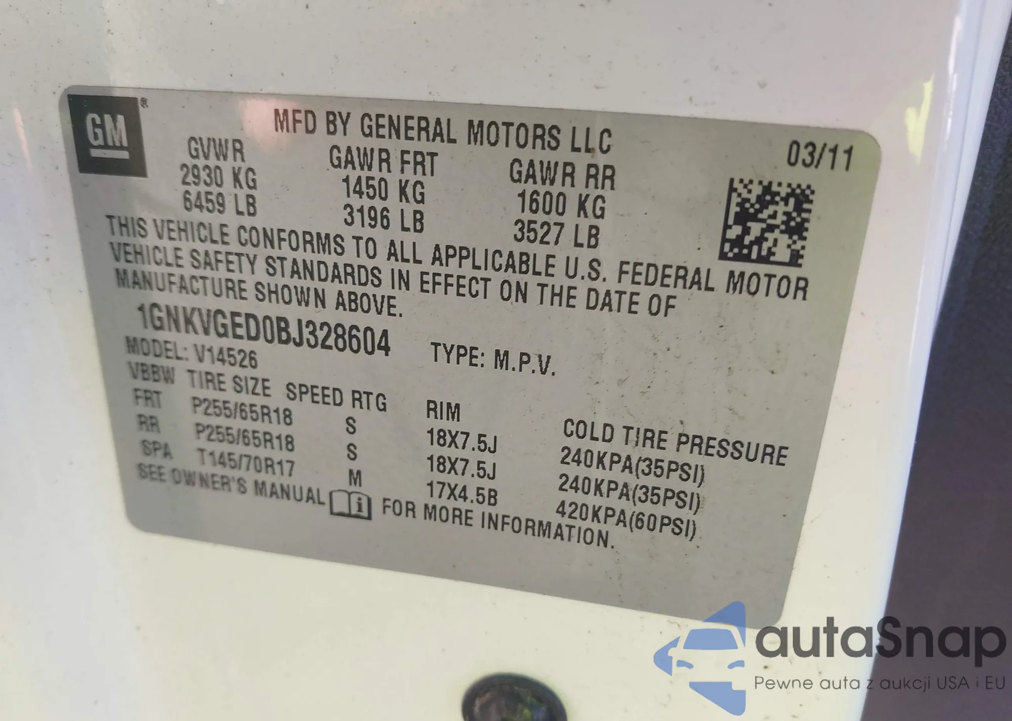 LOT: 43958964 VIN: 1GNKVGED0BJ328604