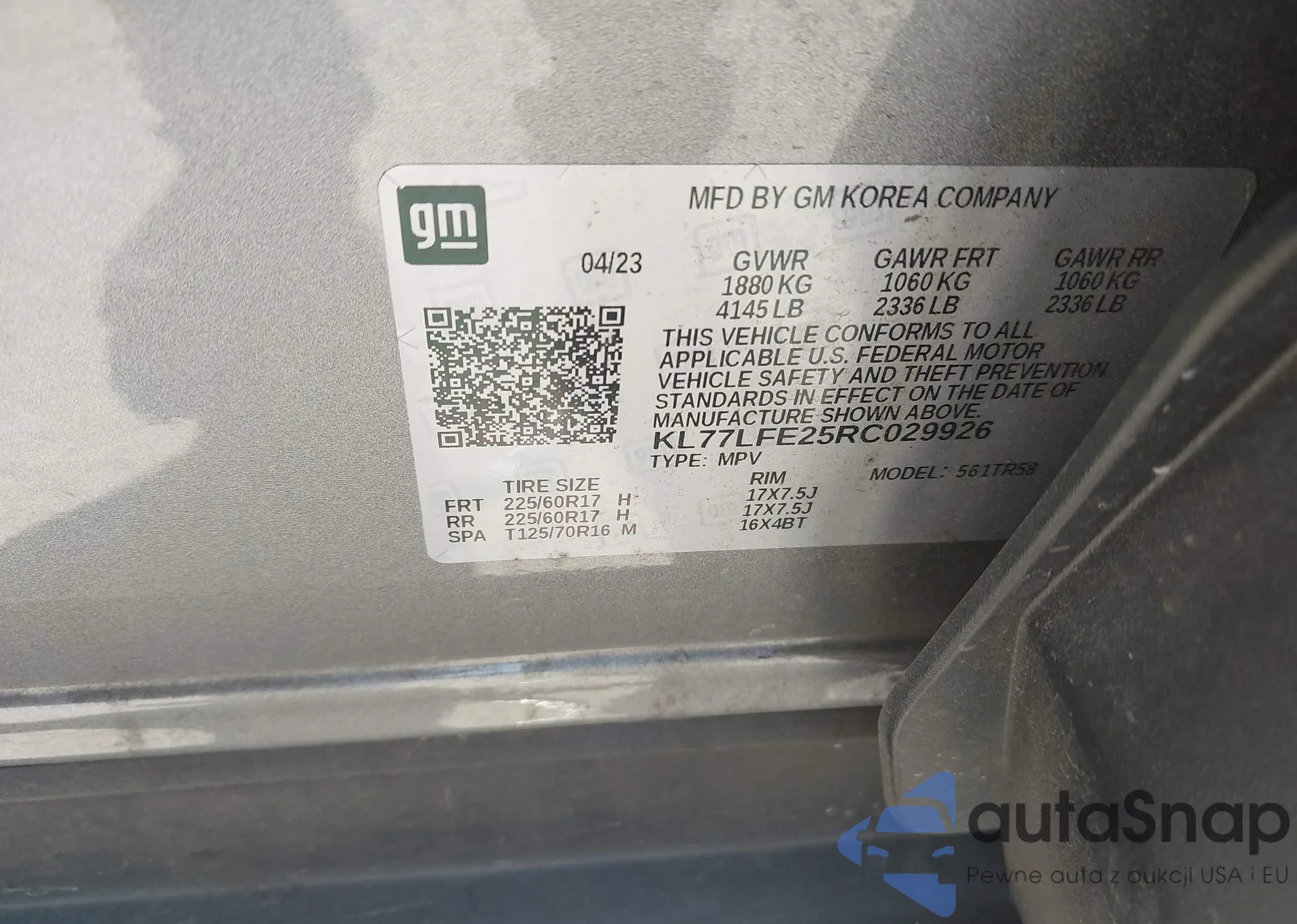 • VIN KL77LFE25RC029926