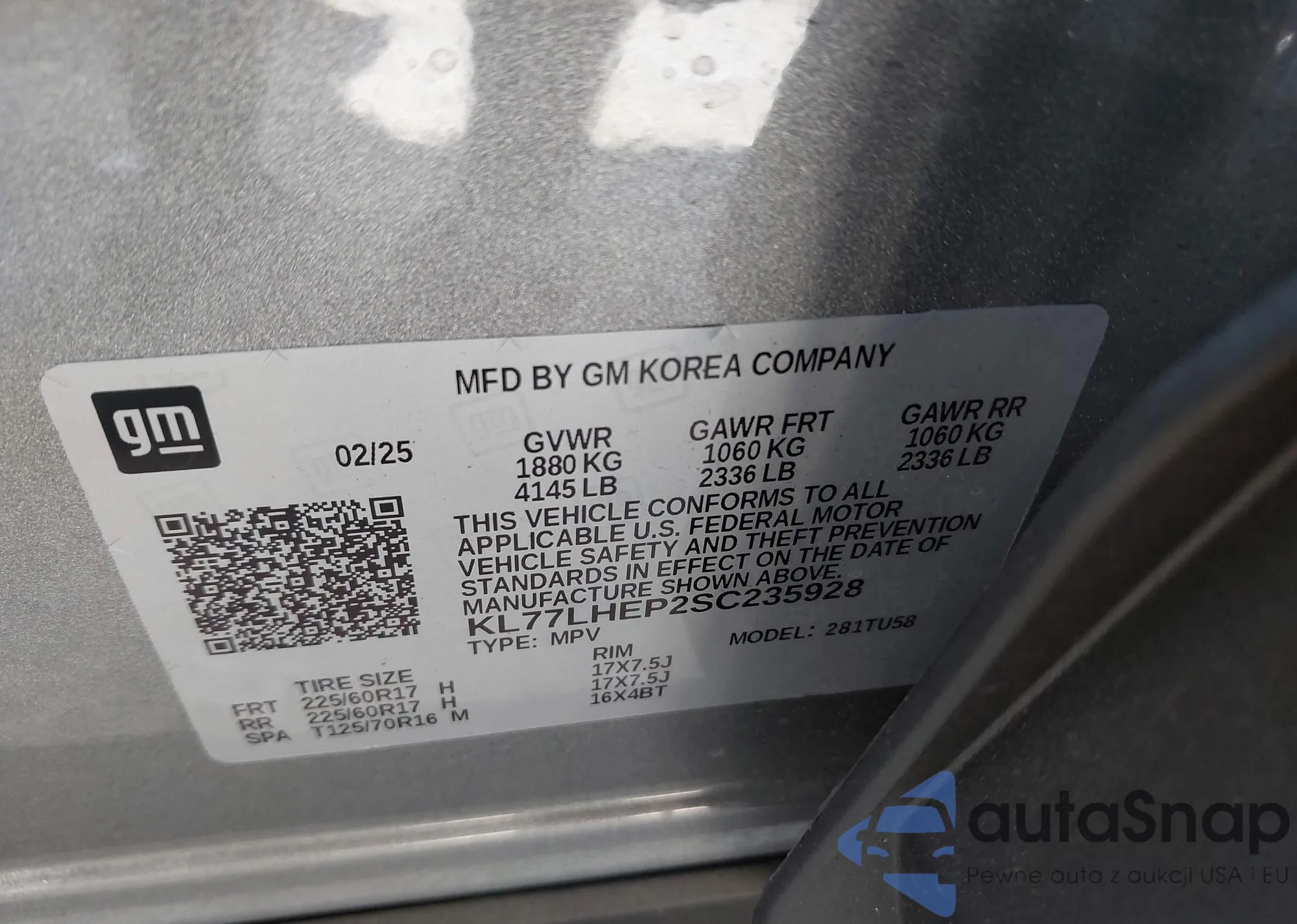 LOT: 43088752 VIN: KL77LHEP2SC235928