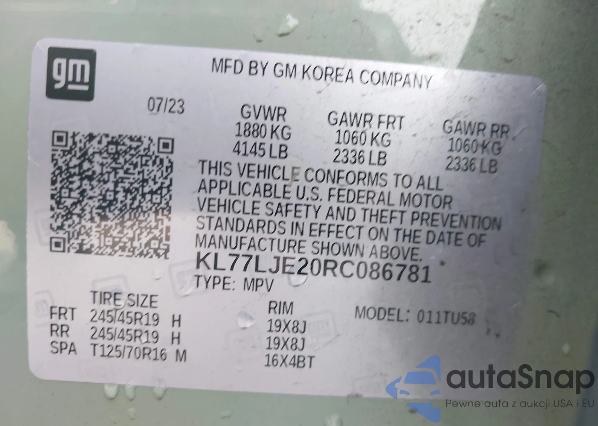 • VIN KL77LJE20RC086781