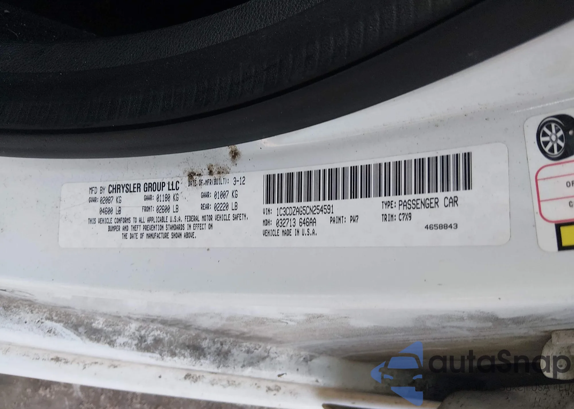 LOT: 43970279 VIN: 1C3CDZAB2CN212464