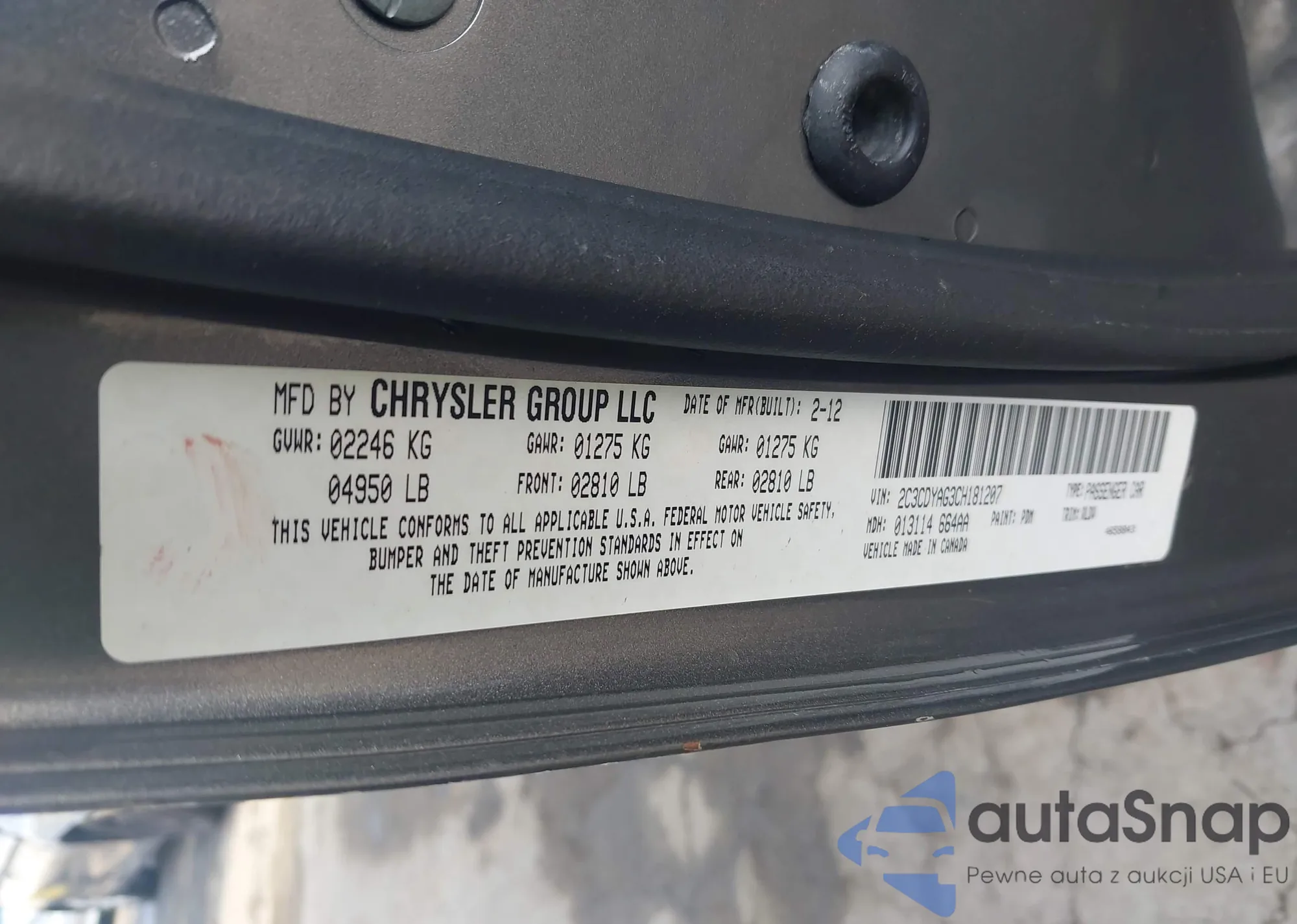 LOT: 43911059 VIN: 2C3CDYAG3CH181207