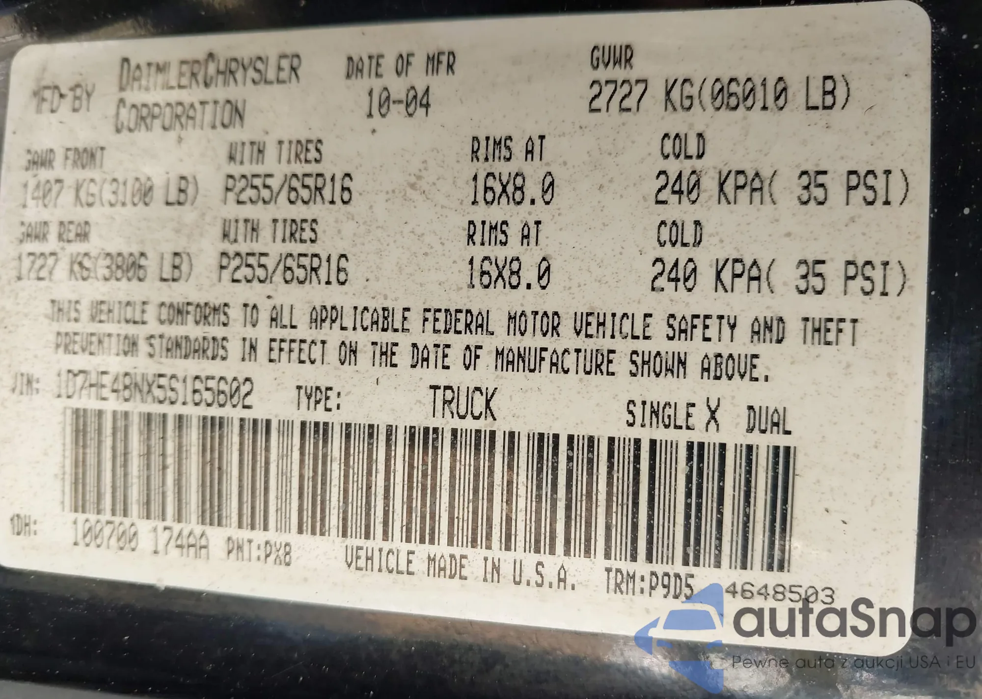 • VIN 1D7HE48NX5S165602