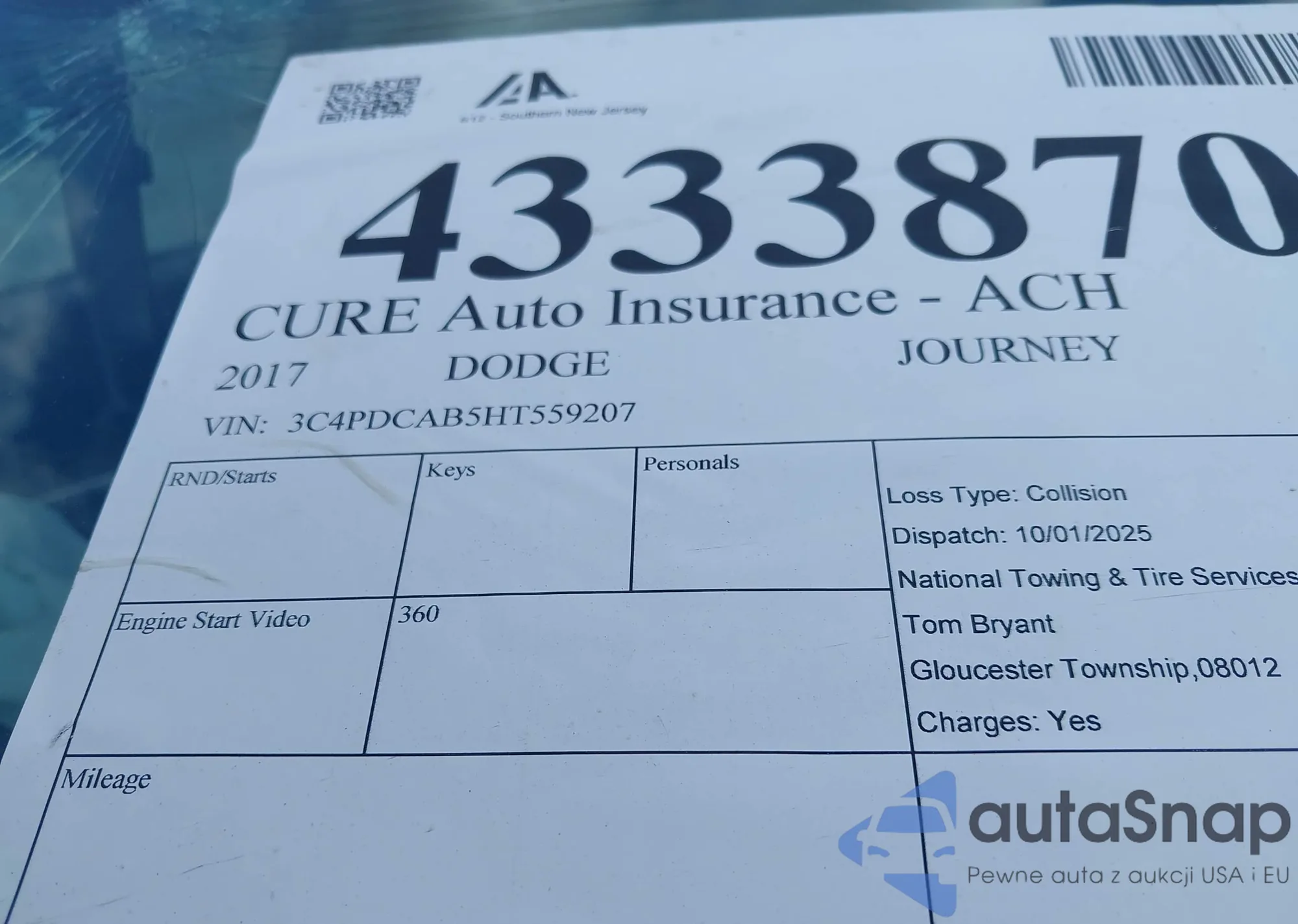 LOT: 43338706 VIN: 3C4PDCAB5HT559207