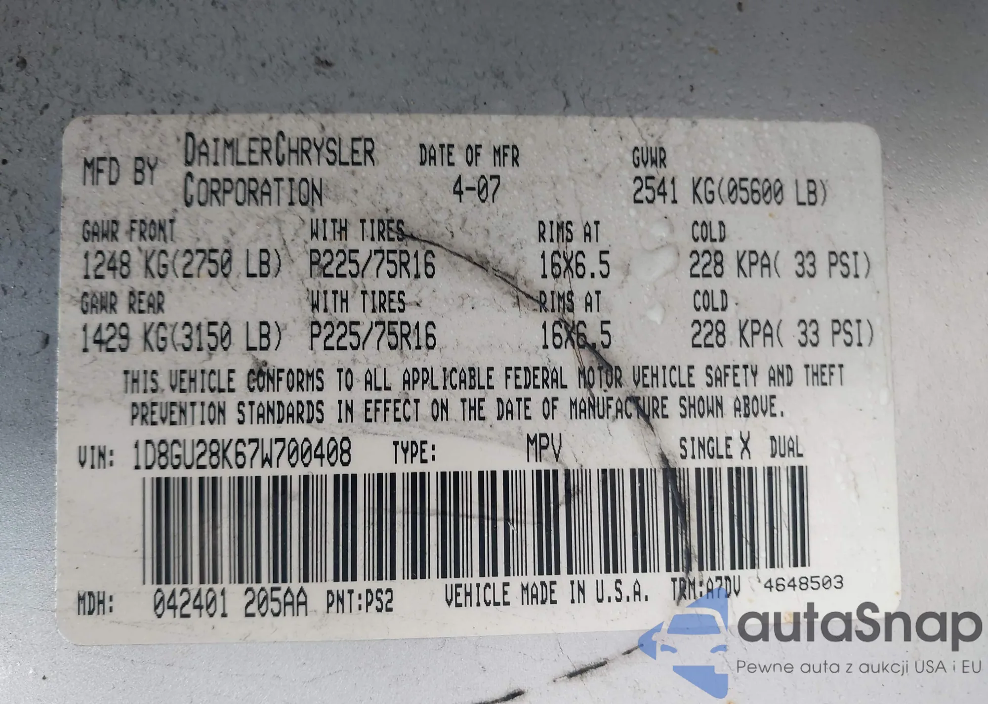 • VIN 1D8GU28K67W700408