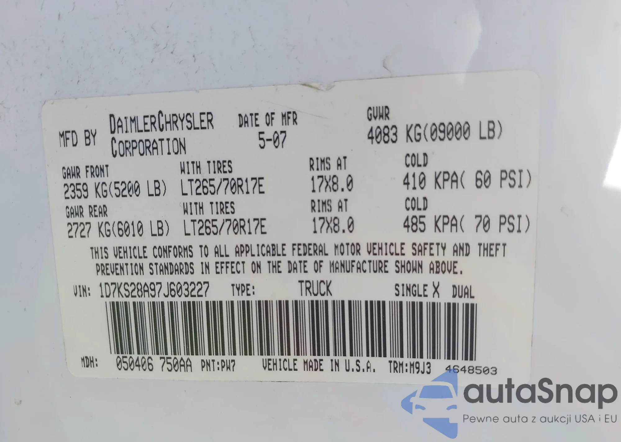 LOT: 43008031 VIN: 1D7KS28A97J603227