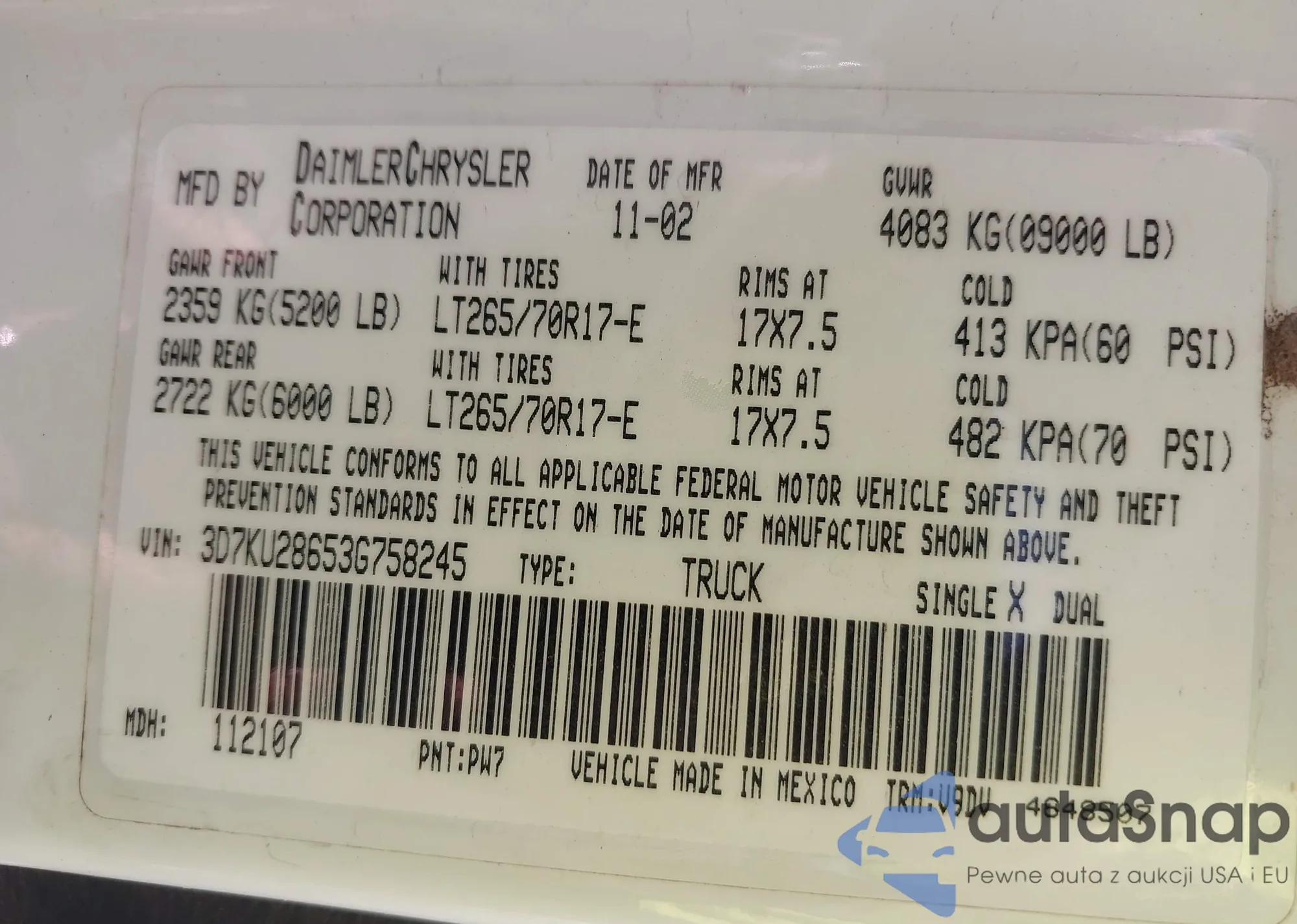 LOT: 43016446 VIN: 3D7KU28653G758245