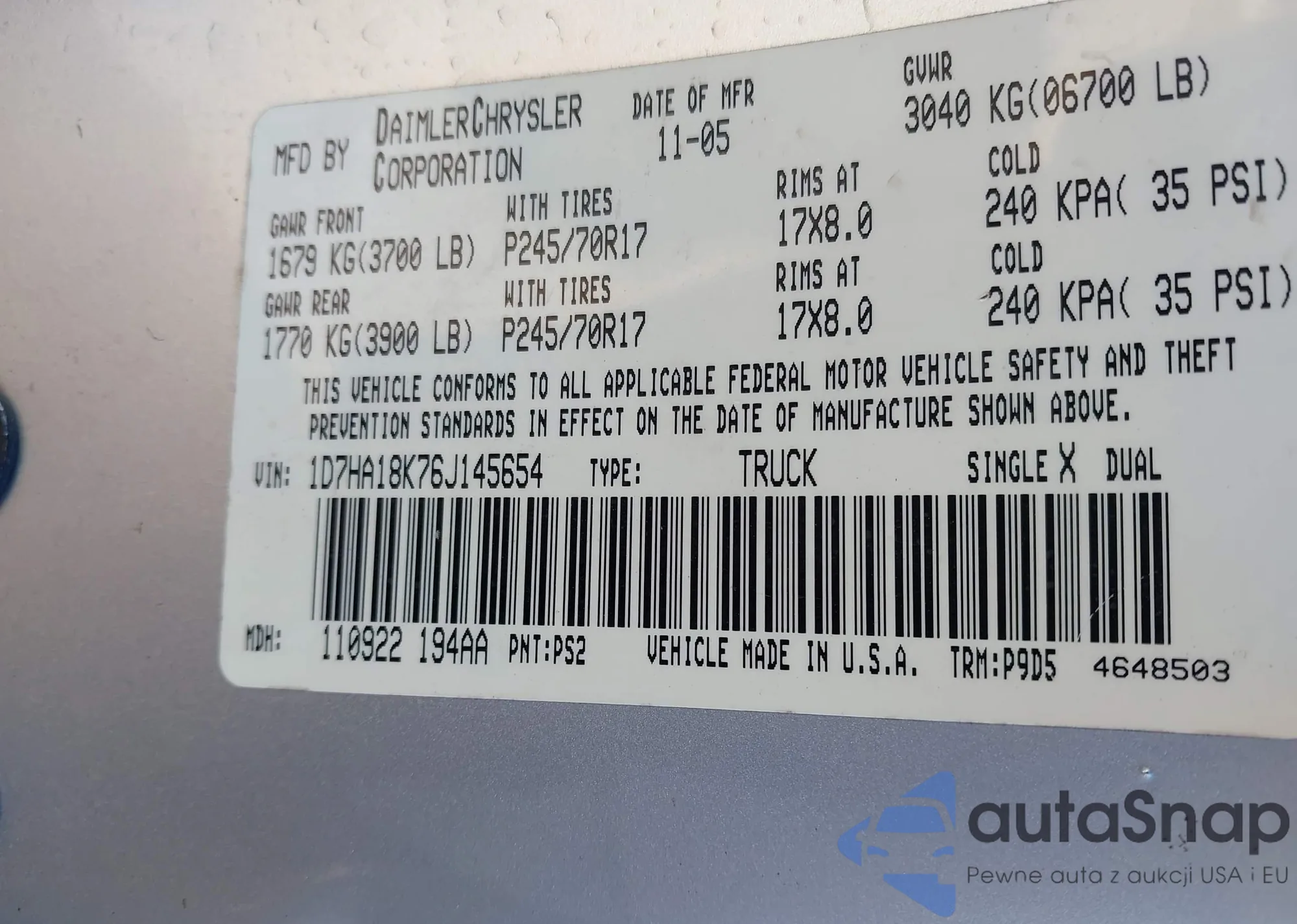 • VIN 1D7HA18K76J145654