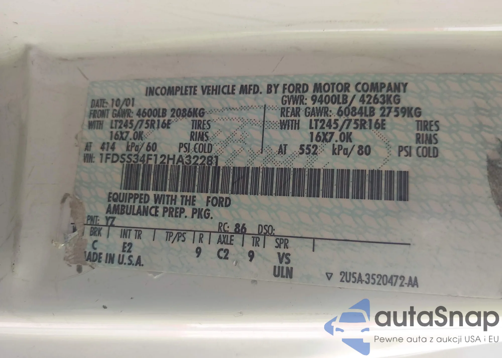 LOT: 40523064 VIN: 1FDSS34F12HA32281