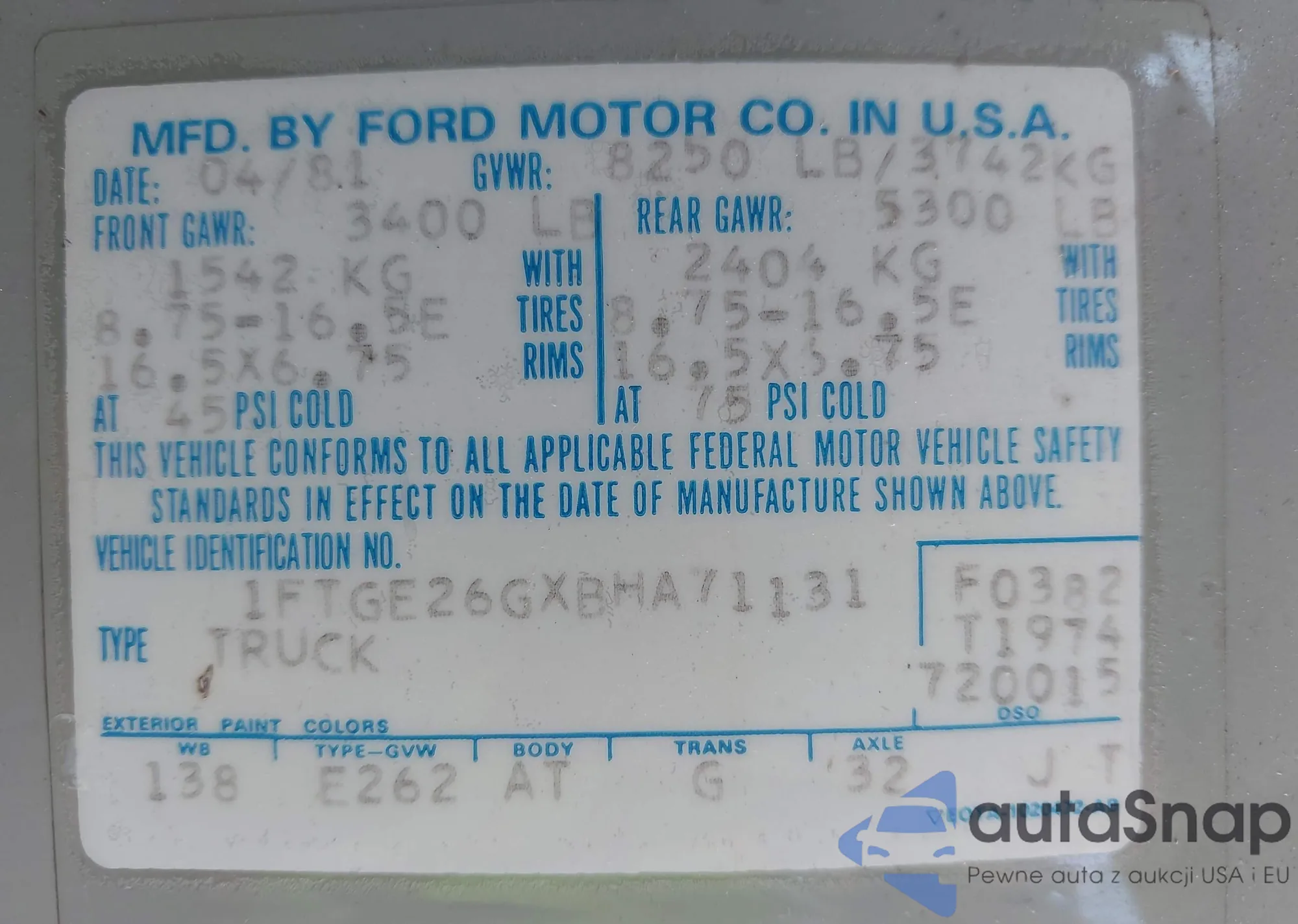 • VIN 1FTGE26GXBHA71131