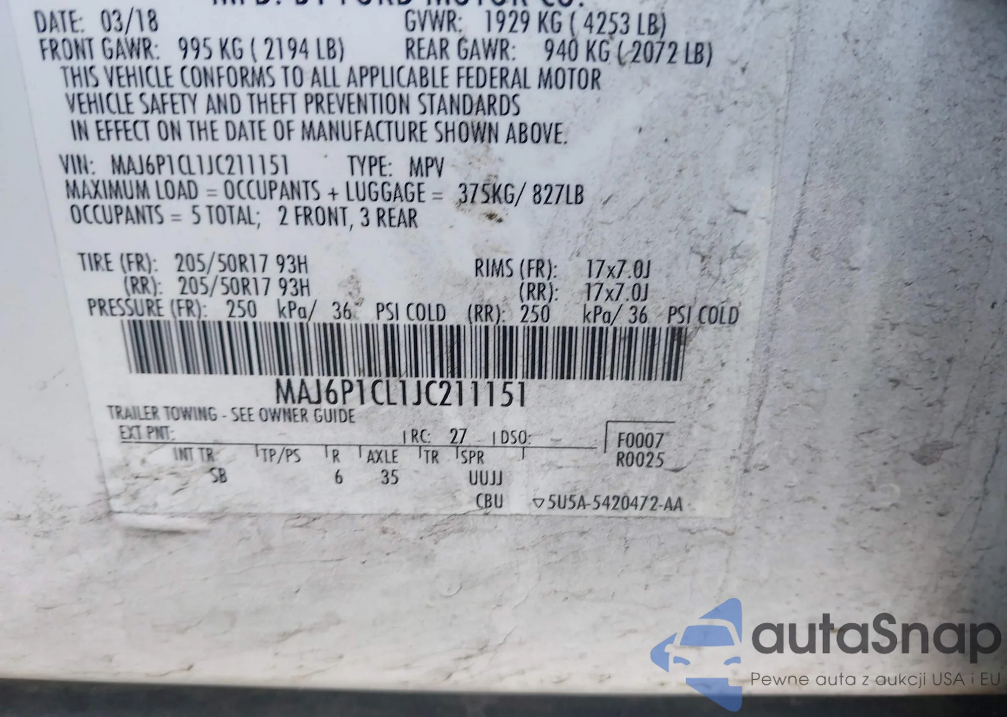 LOT: 43652445 VIN: MAJ6P1CL1JC211151