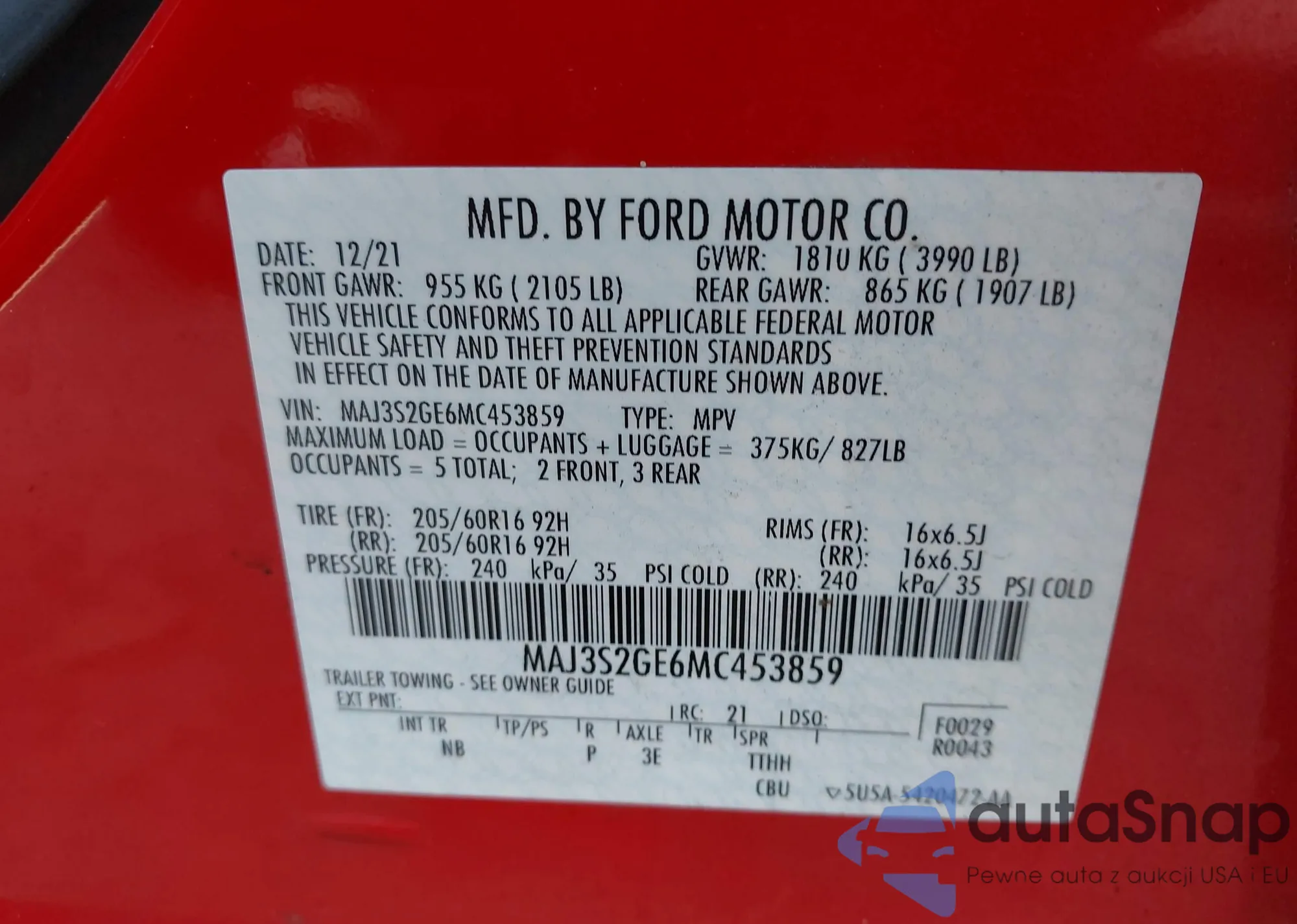 LOT: 43649433 VIN: MAJ6S3FL8MC429730