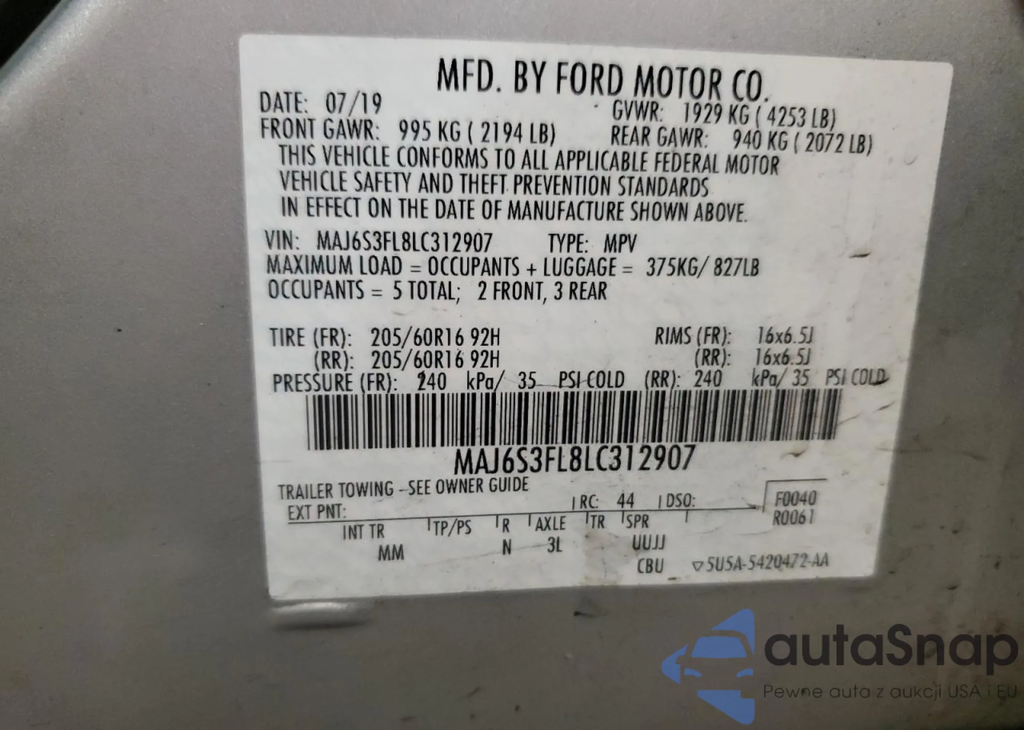 • VIN MAJ6S3FL8LC312907