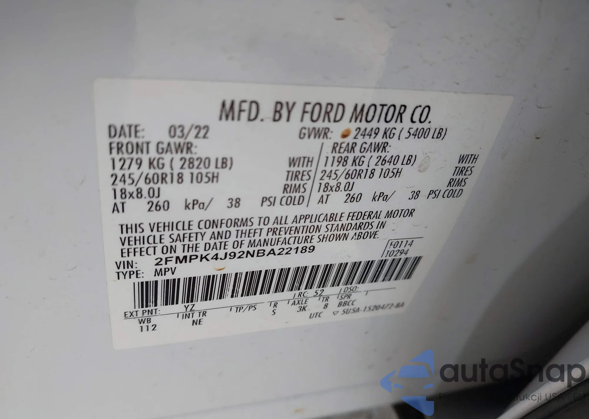 • VIN 2FMPK4J92NBA22189