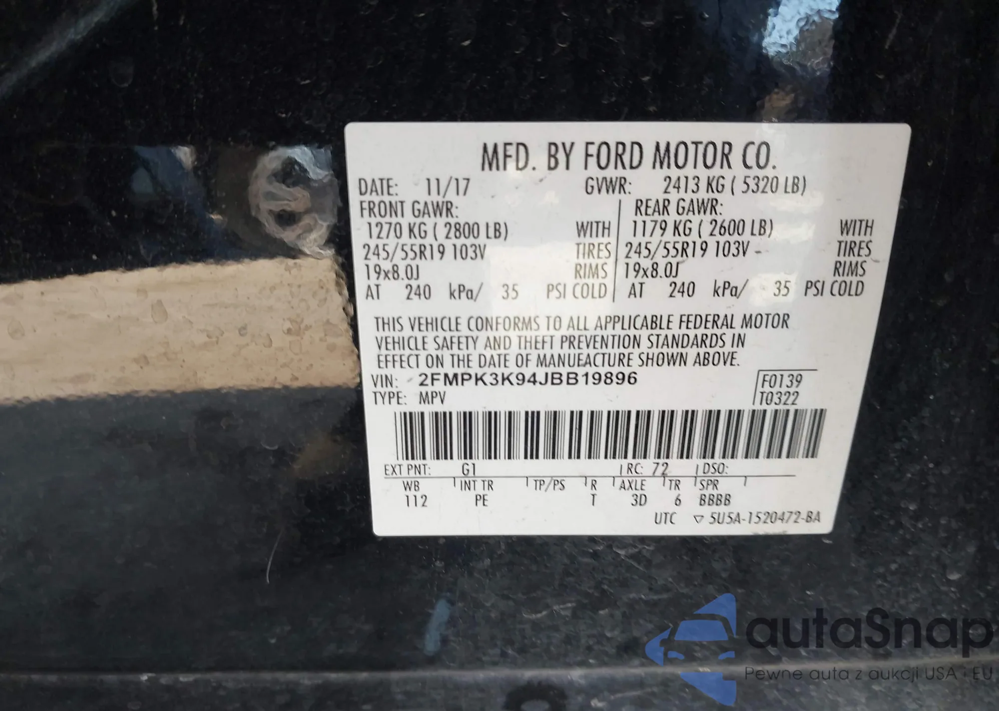 LOT: 43368918 VIN: 2FMPK3K94JBB19896