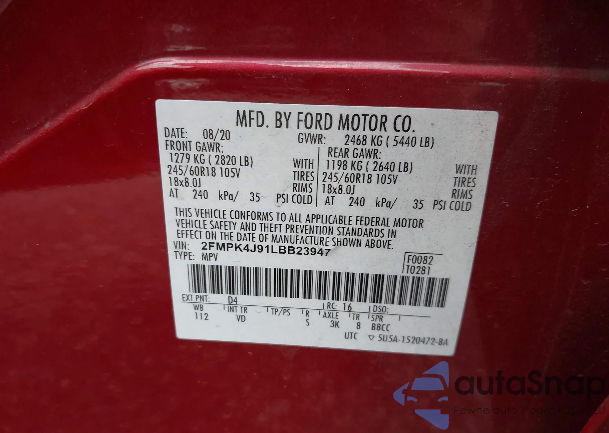 • VIN 2FMPK4J91LBB23947