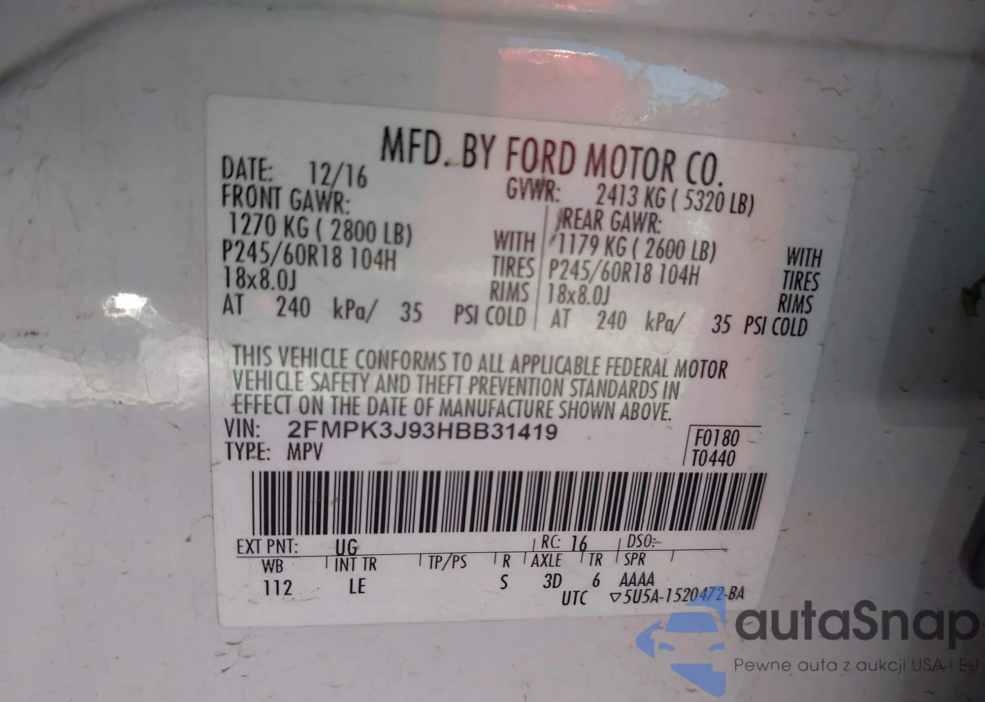LOT: 43666240 VIN: 2FMPK3G98HBC21981