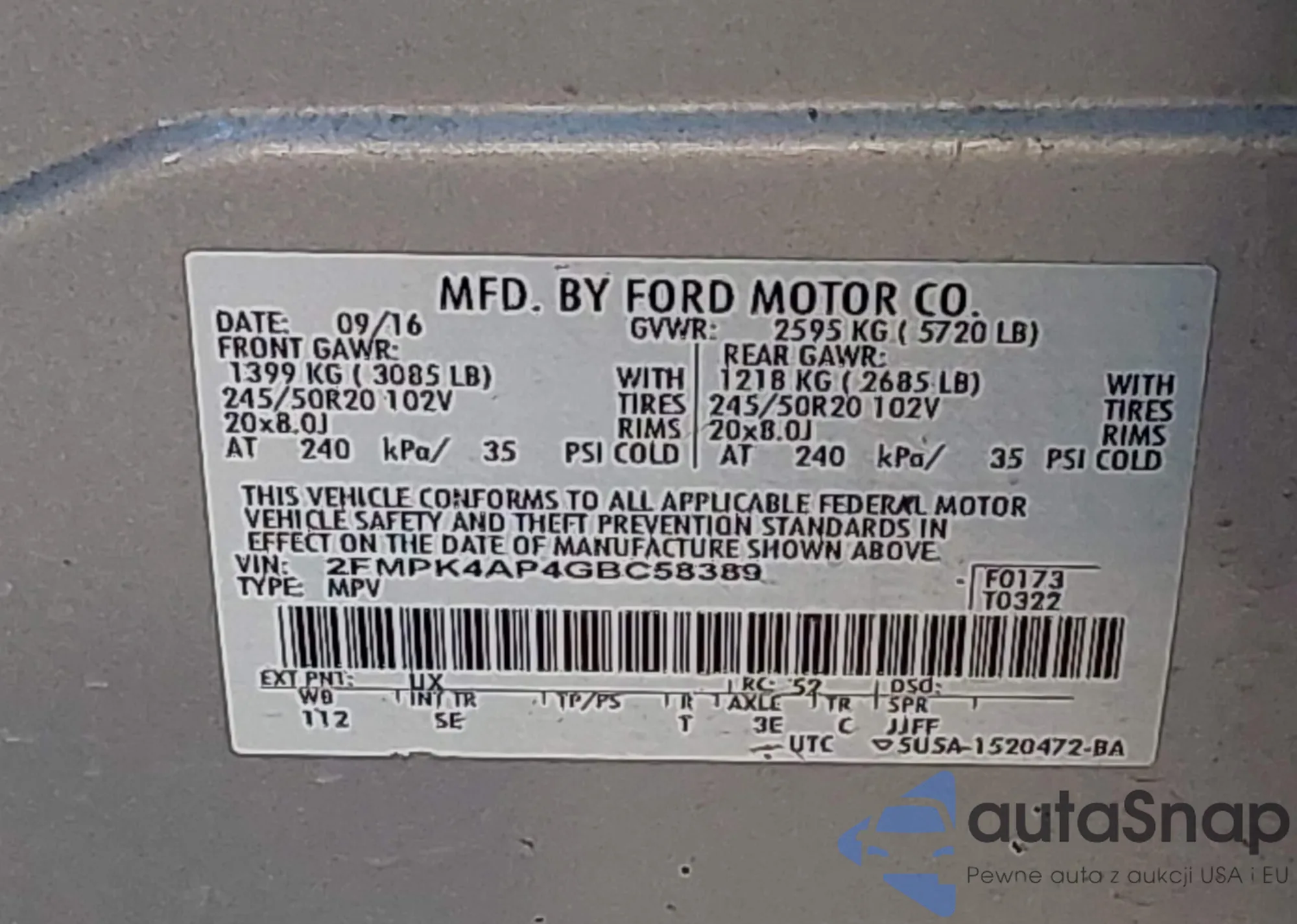 LOT: 43594569 VIN: 2FMPK4AP4GBC58389