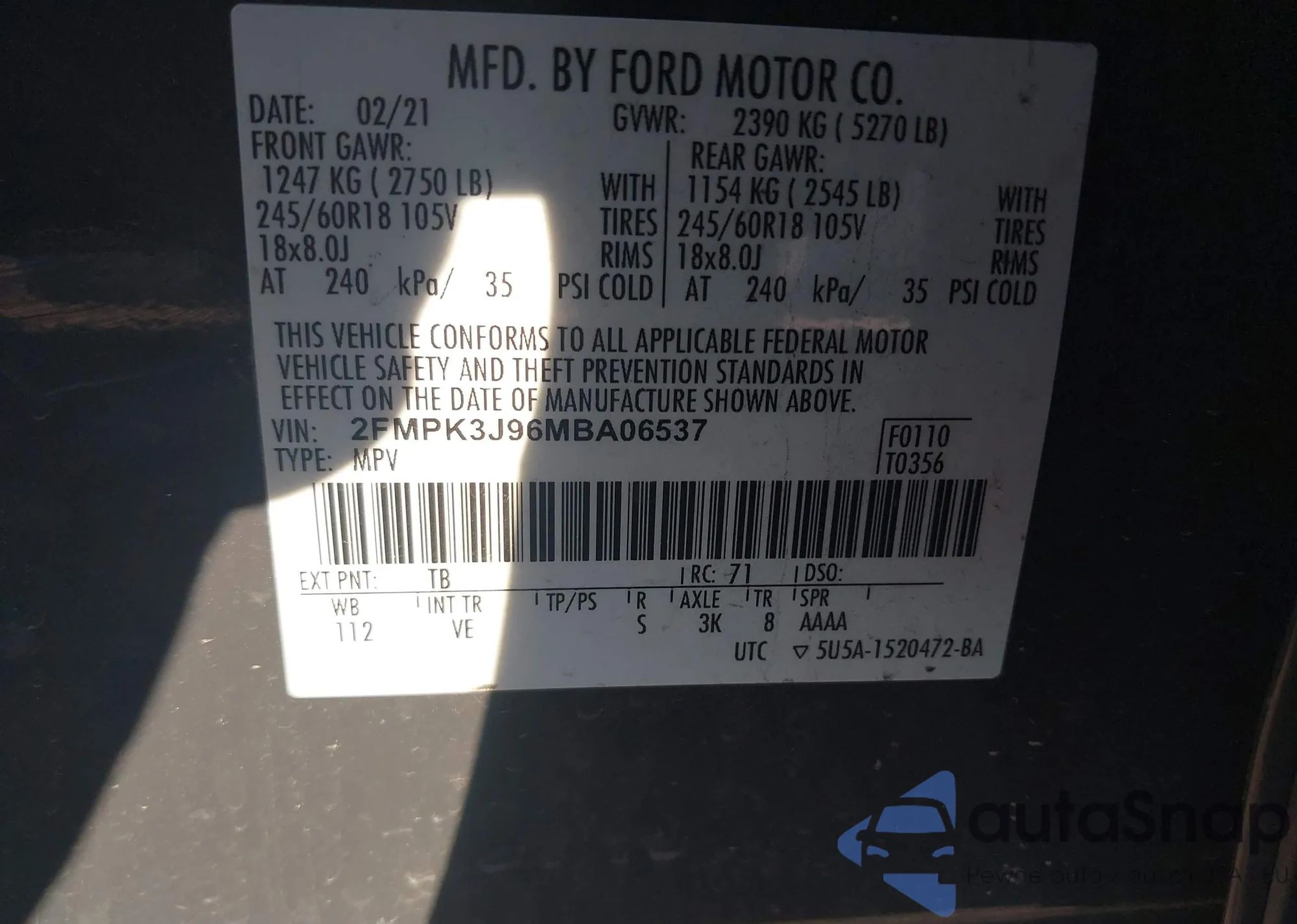 • VIN 2FMPK3J96MBA06537
