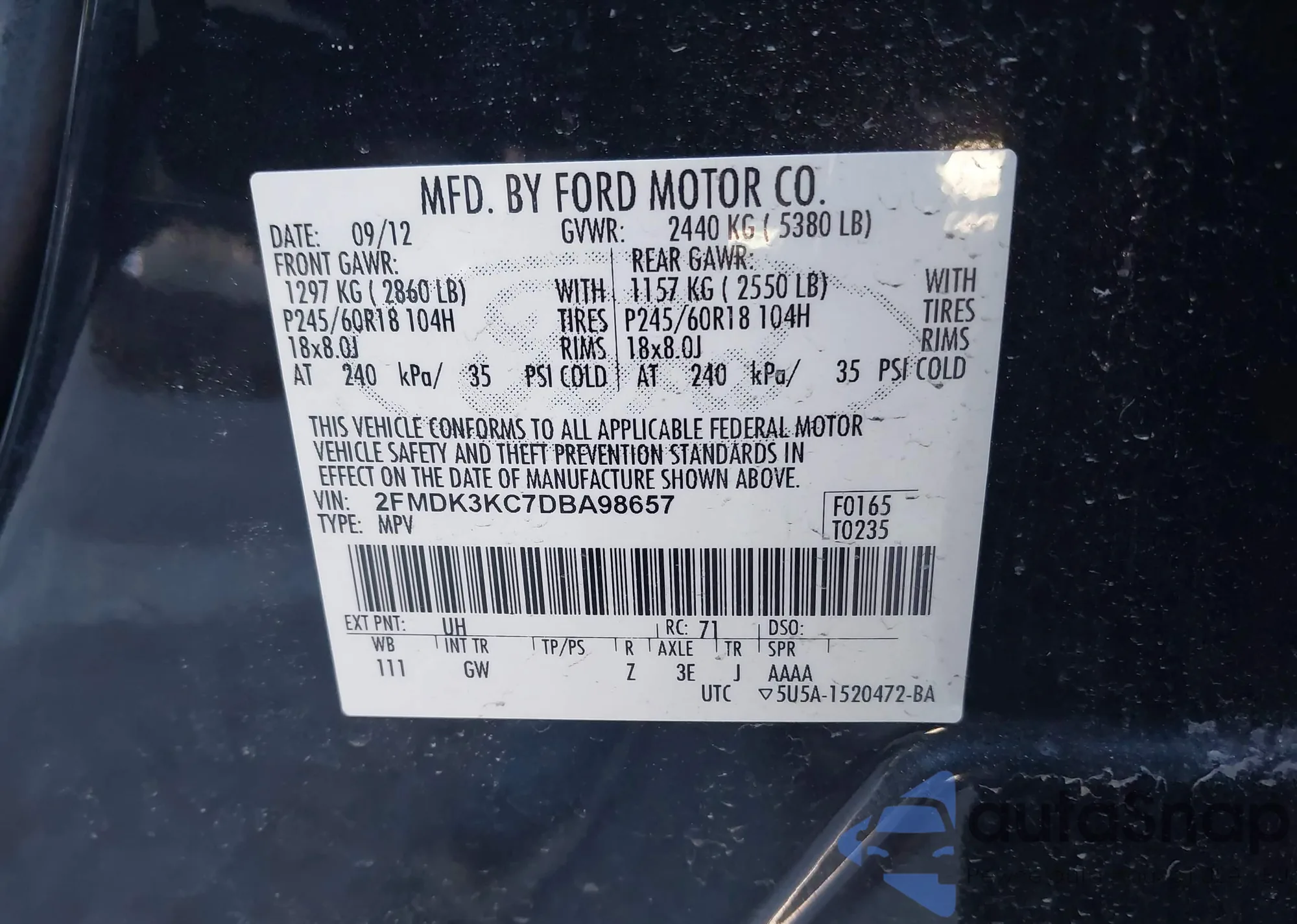 • VIN 2FMDK3KC7DBA98657