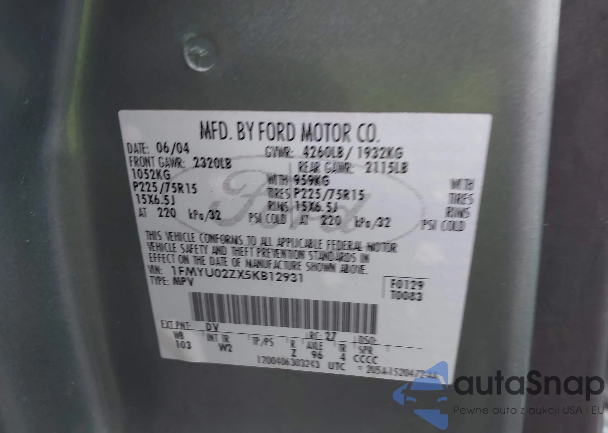 • VIN 1FMYU02ZX5KB12931