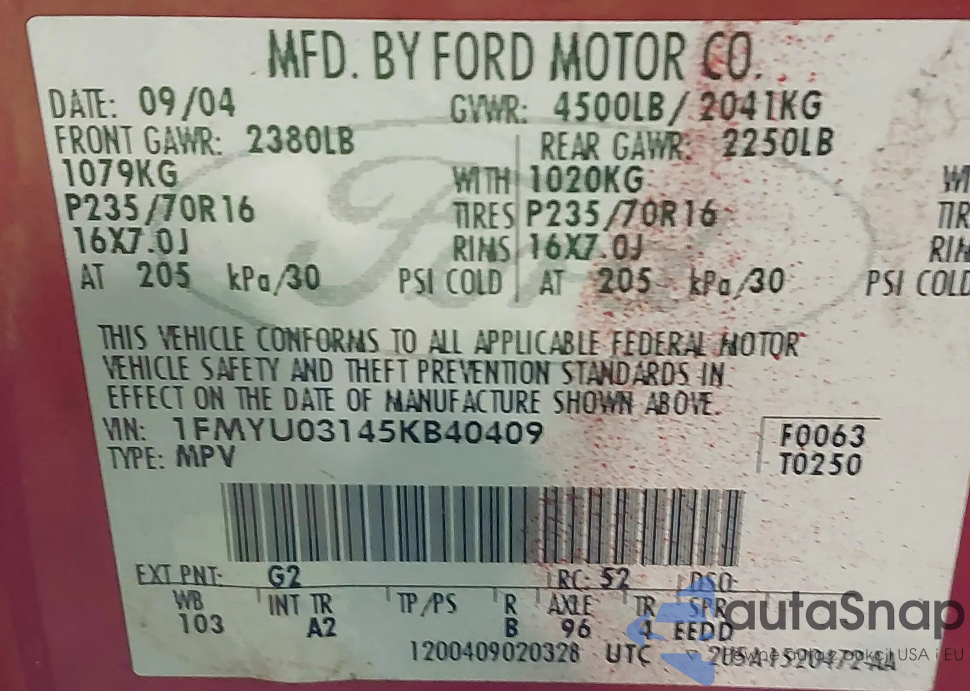 • VIN 1FMYU03145KB40409