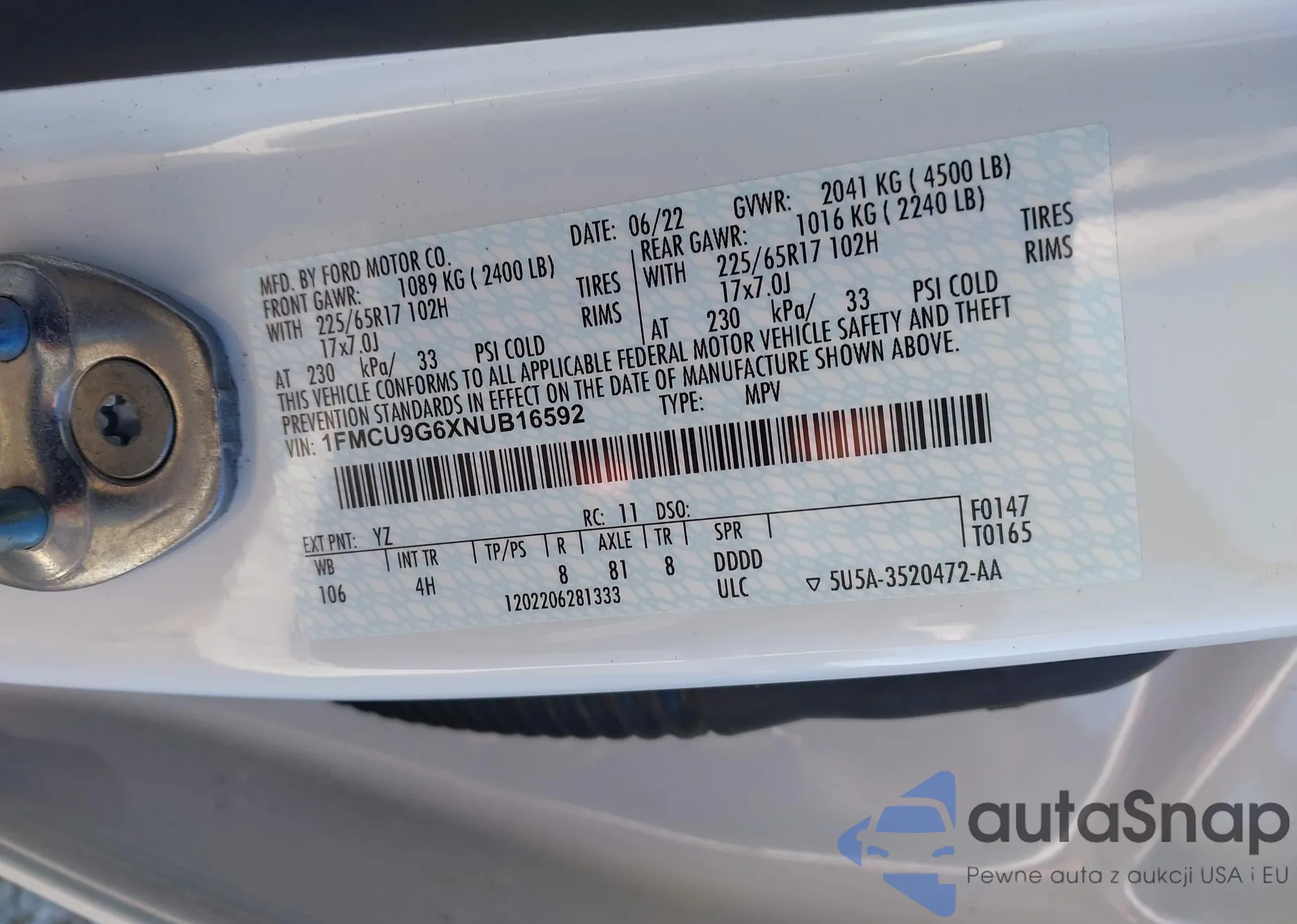 • VIN 1FMCU9G6XNUB16592