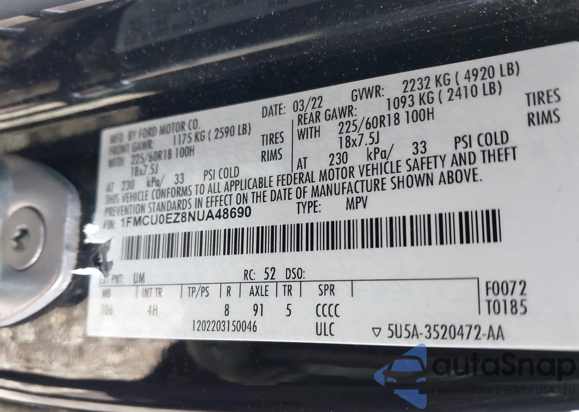 LOT: 44117775 VIN: 1FMCU0EZ8NUA48690