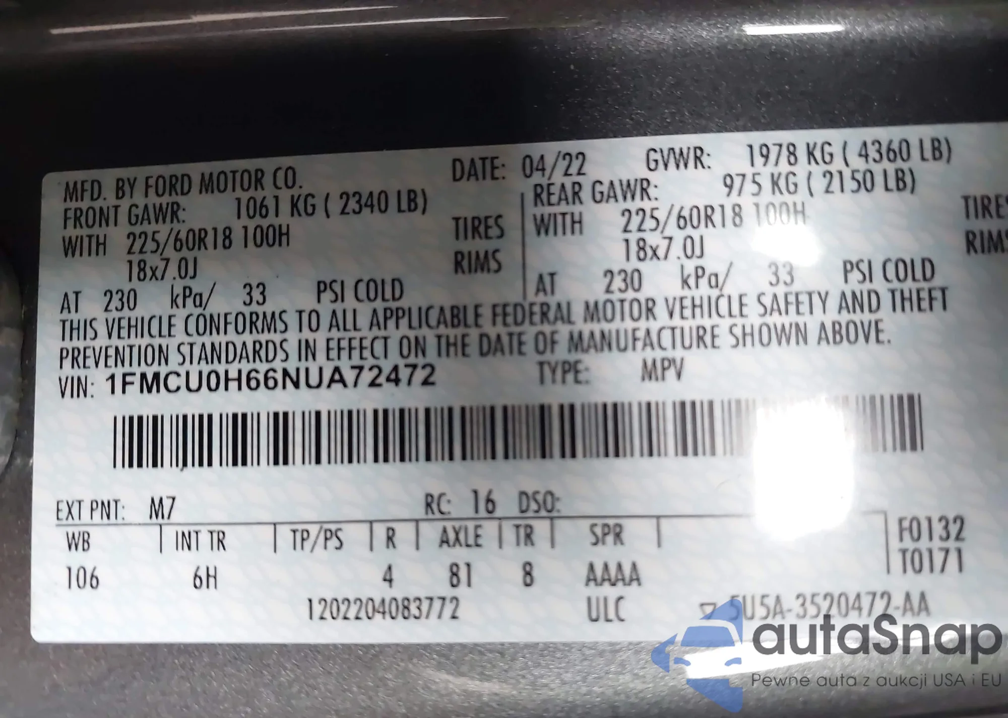 • VIN 1FMCU0H66NUA72472