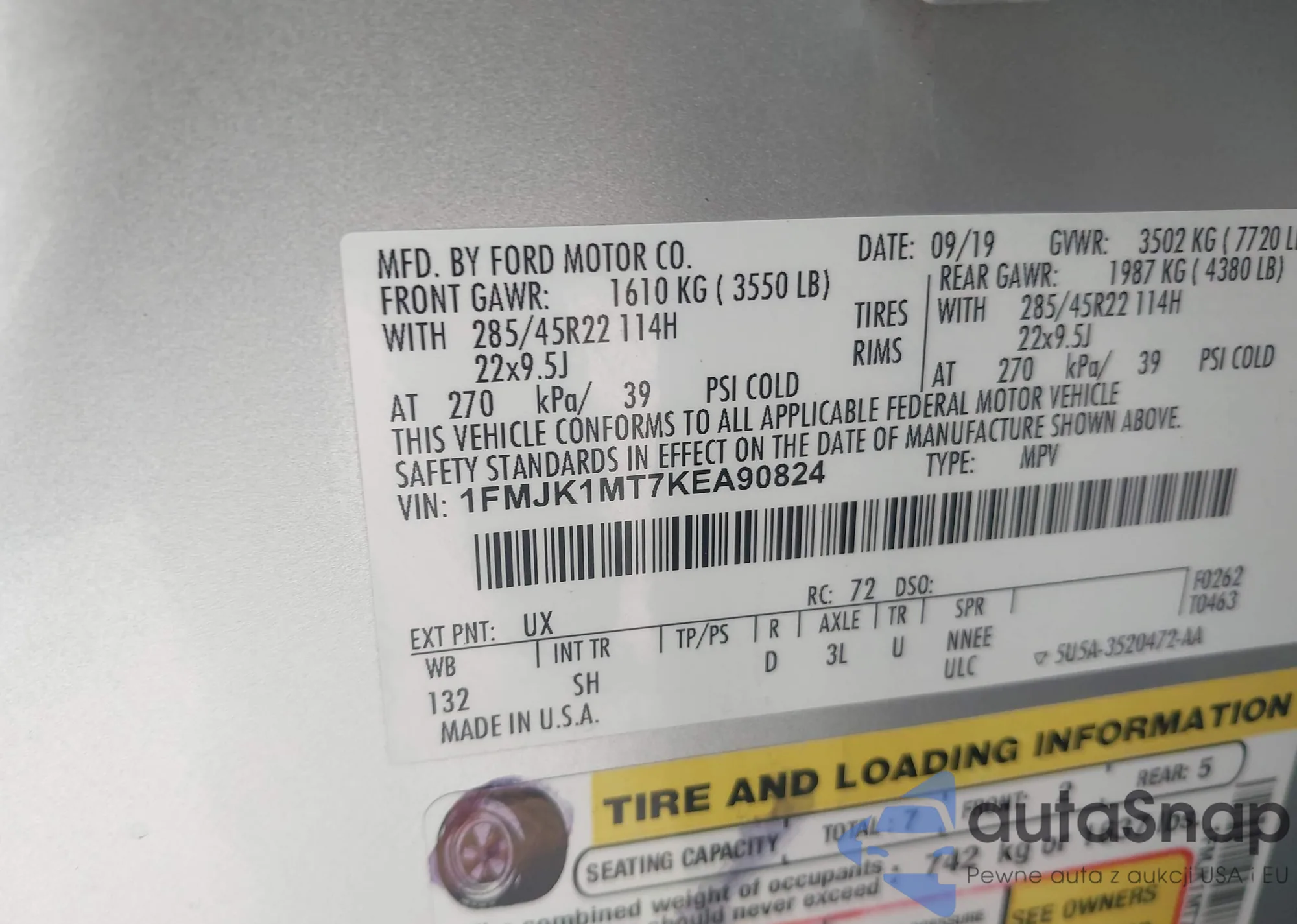 LOT: 44151474 VIN: 1FMJK1MT7KEA90824