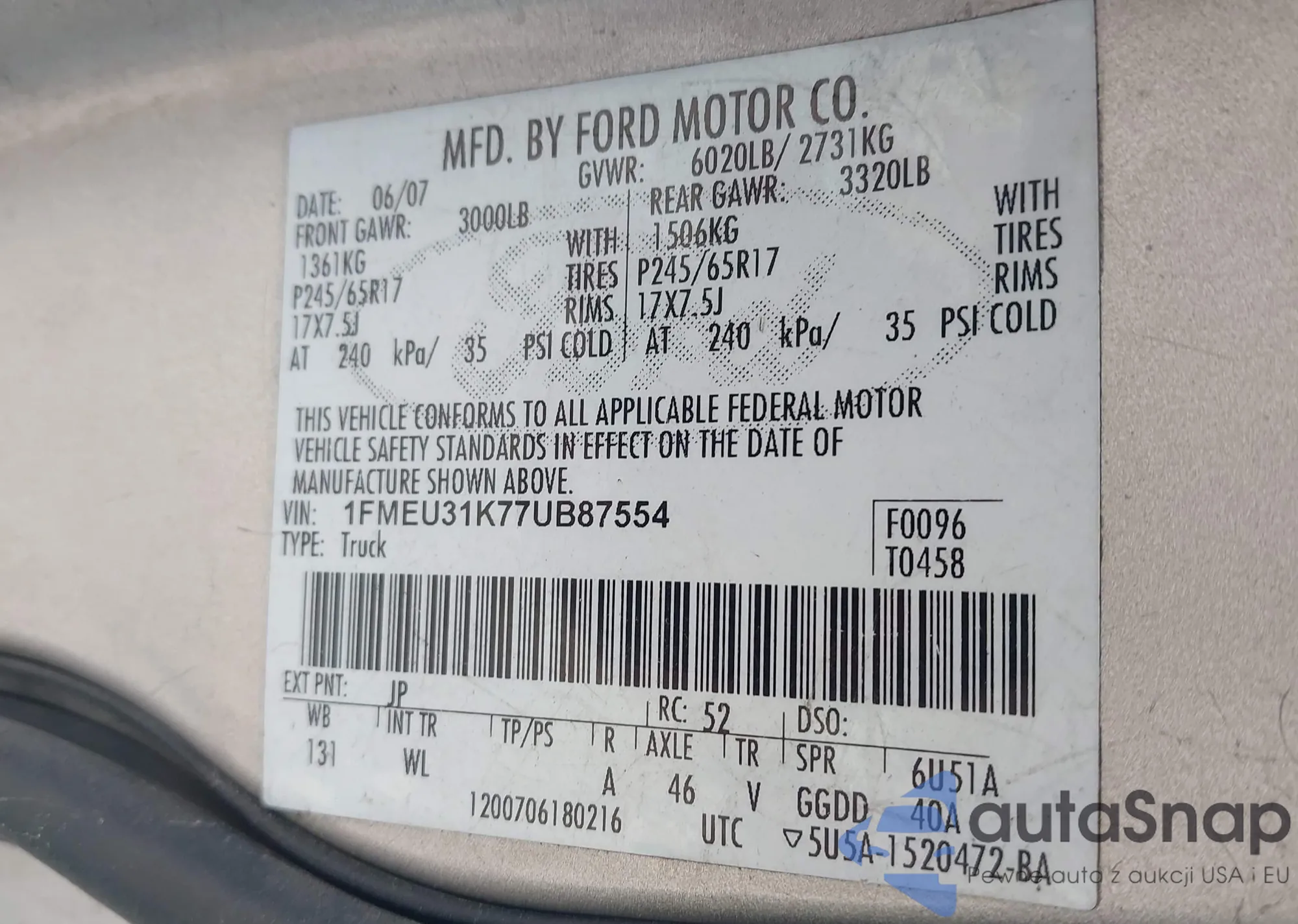 • VIN 1FMEU31K97UA23870