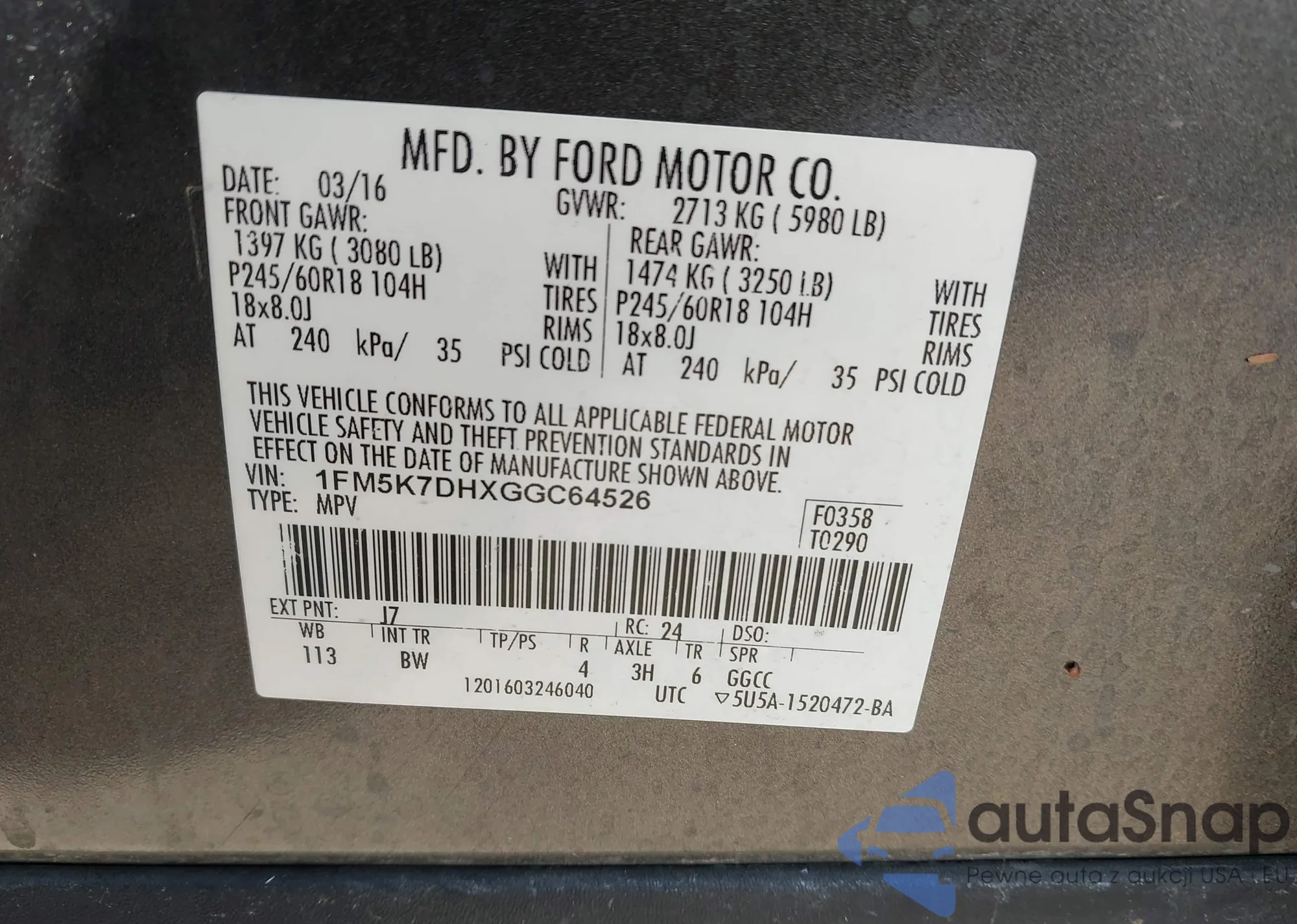 LOT: 44233393 VIN: 1FM5K7DHXGGC64526