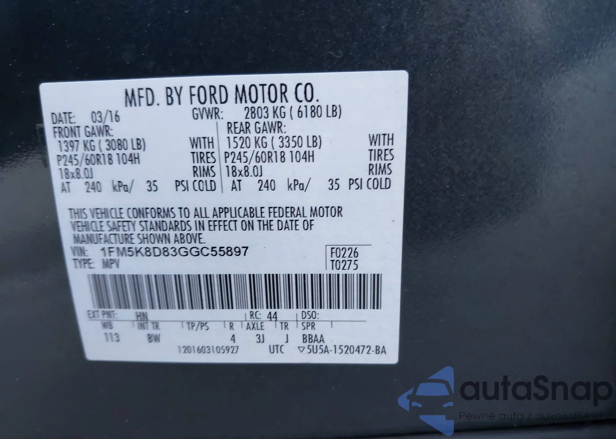 LOT: 44153150 VIN: 1FM5K8D83GGC55897