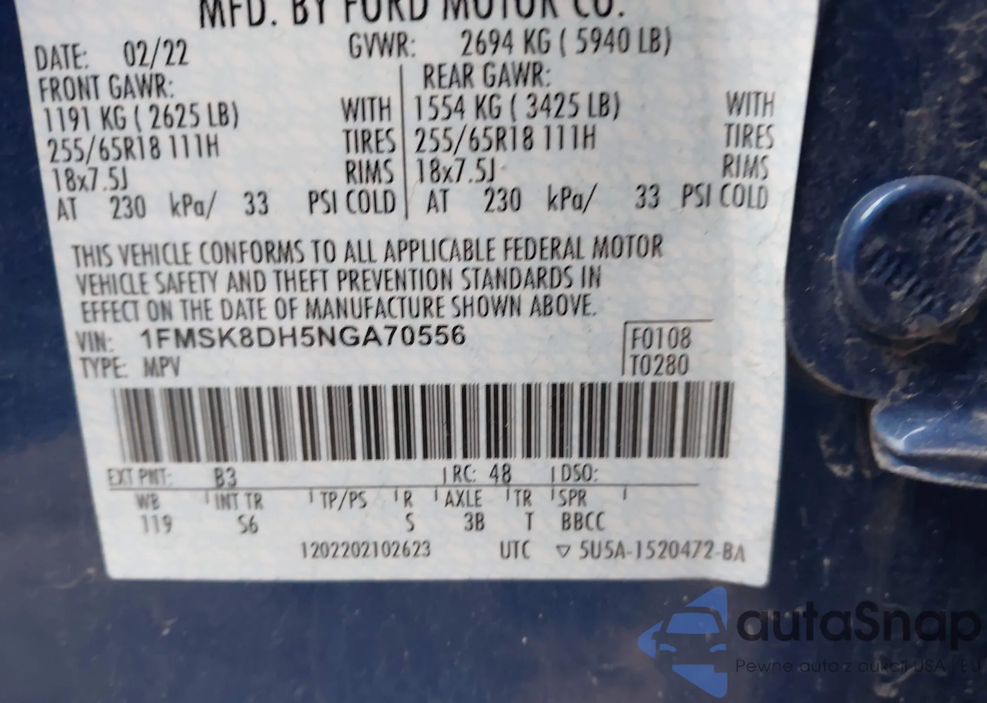 • VIN 1FMSK8DH5NGA70556