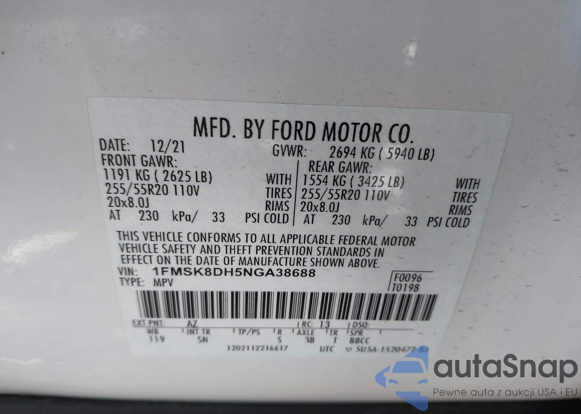 • VIN 1FMSK8DH5NGA38688