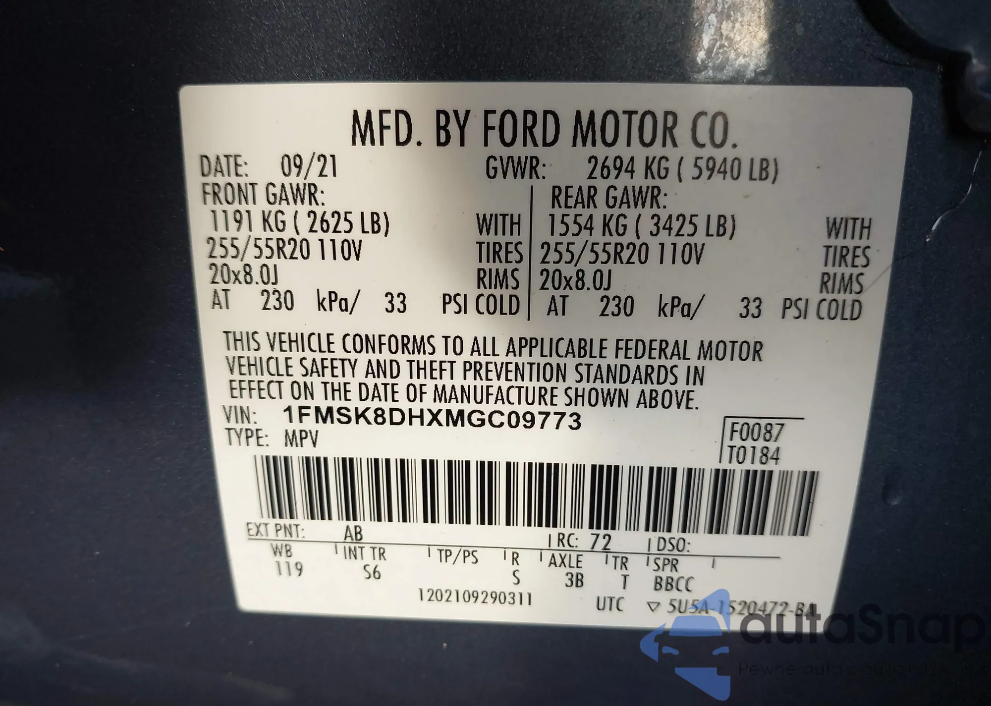 LOT: 44057919 VIN: 1FMSK8DH8MGB87417