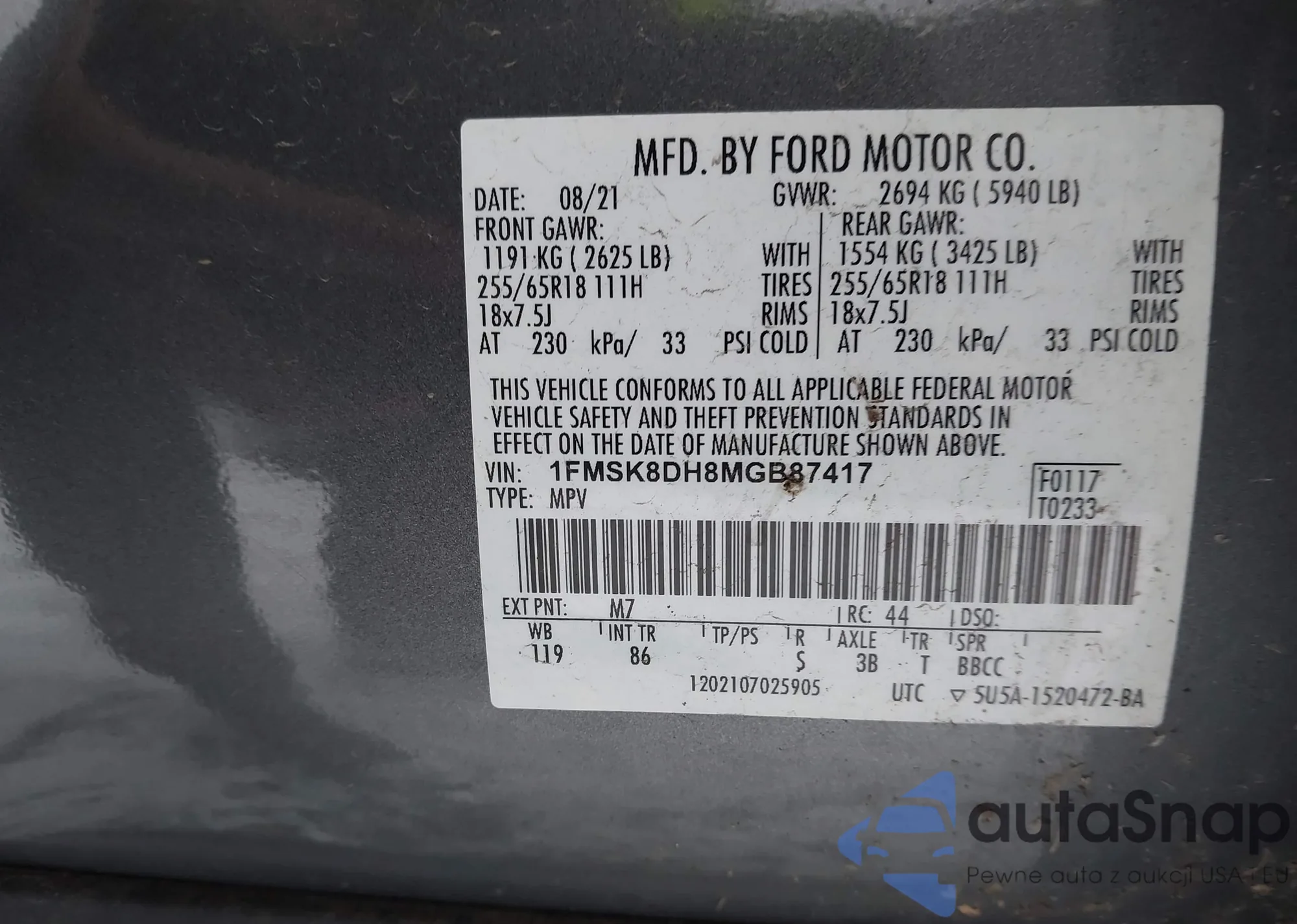 • VIN 1FMSK8DH8MGB87417