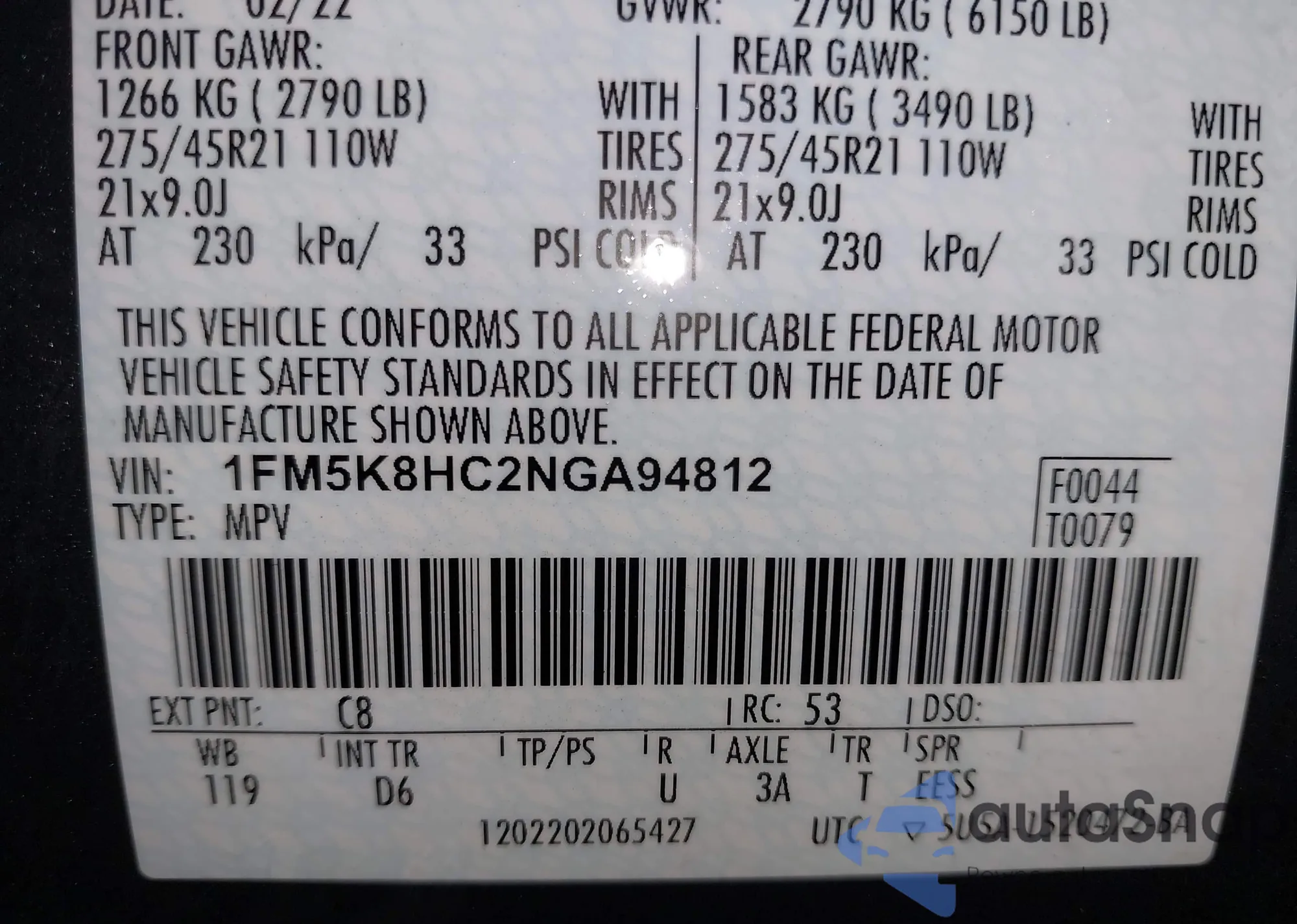 LOT: 44044302 VIN: 1FMSK8FH1MGA21849