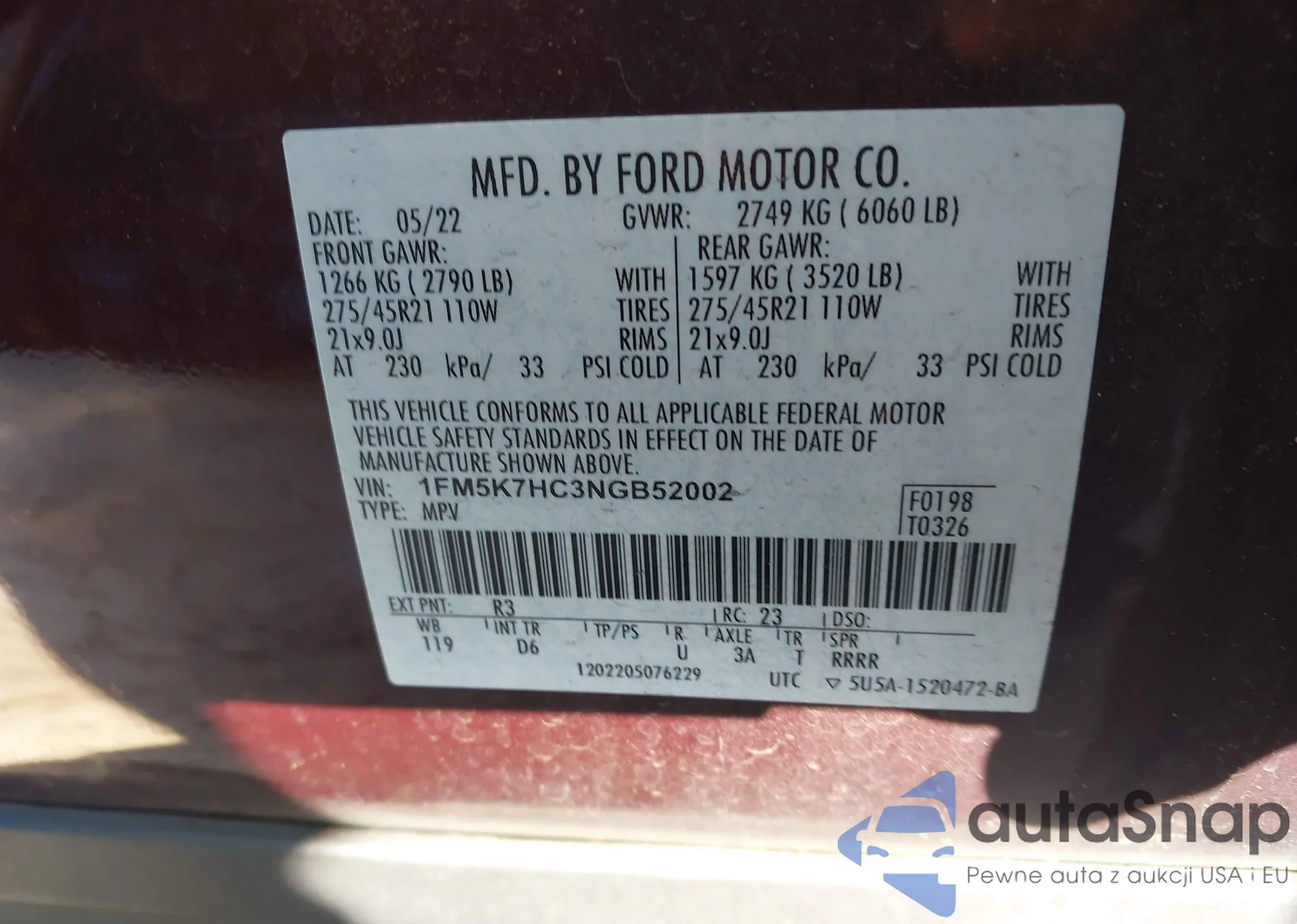 • VIN 1FM5K7HC3NGB52002