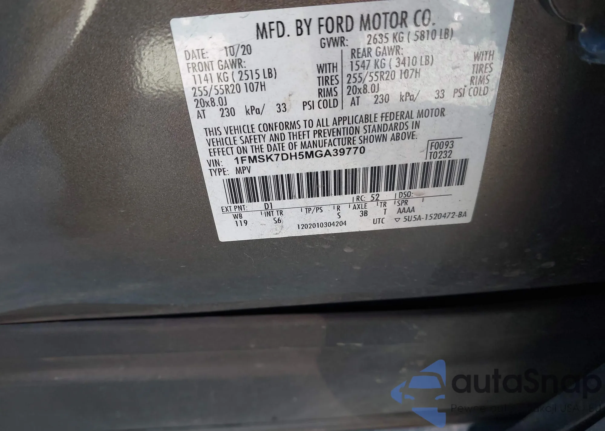 LOT: 44042430 VIN: 1FMSK7DH5MGA39770