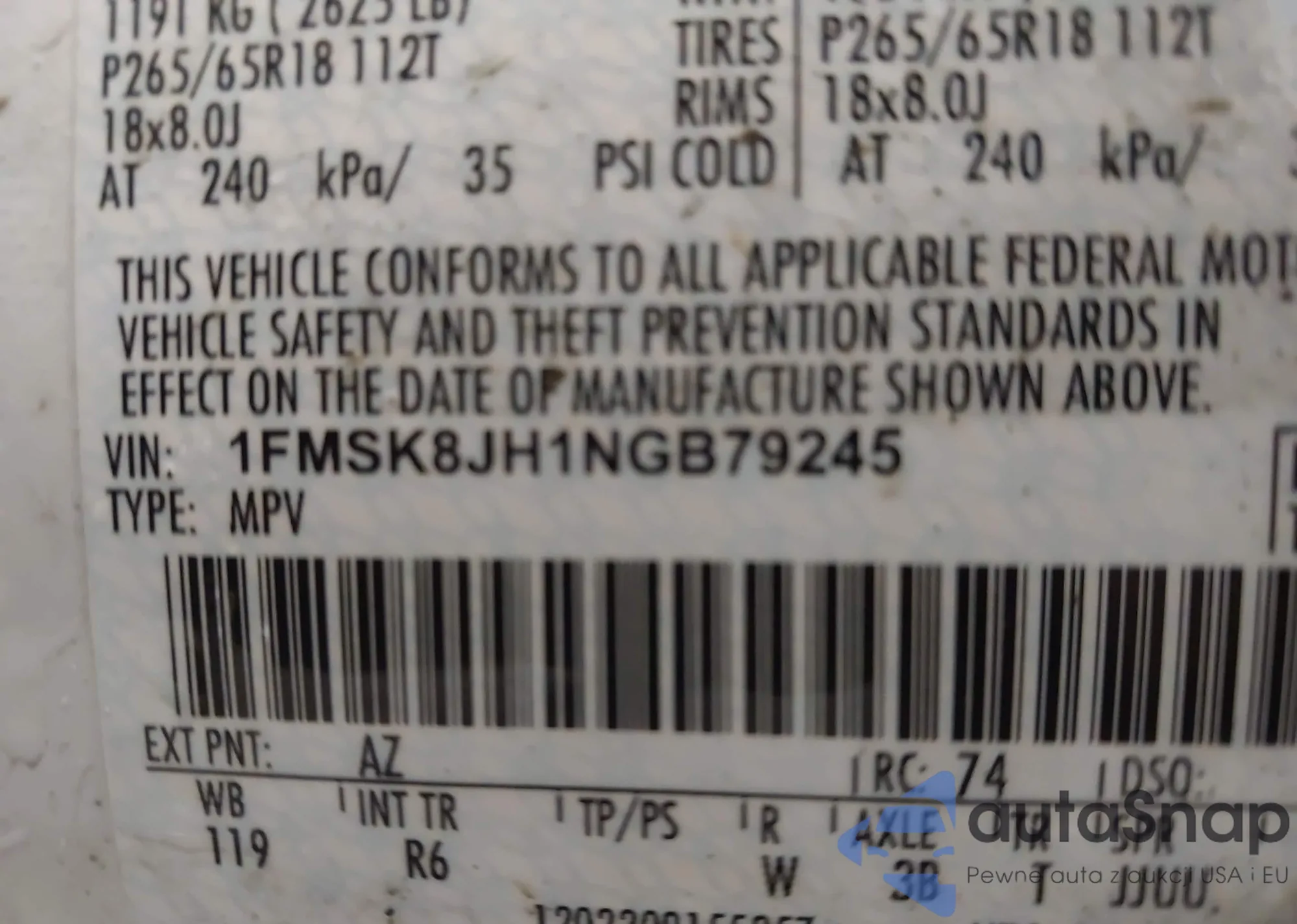 • VIN 1FMSK8JH1NGB79245