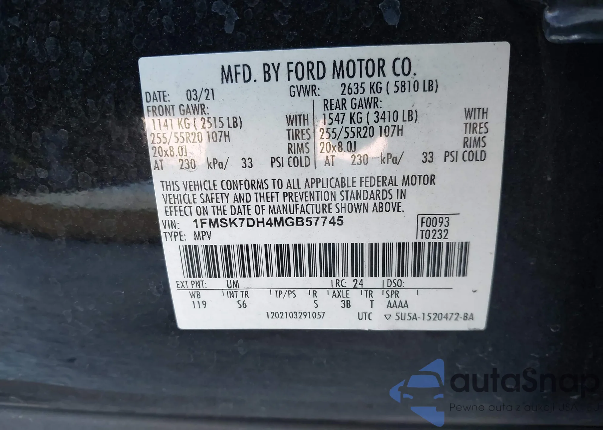 LOT: 44251313 VIN: 1FMSK7DH4MGB57745