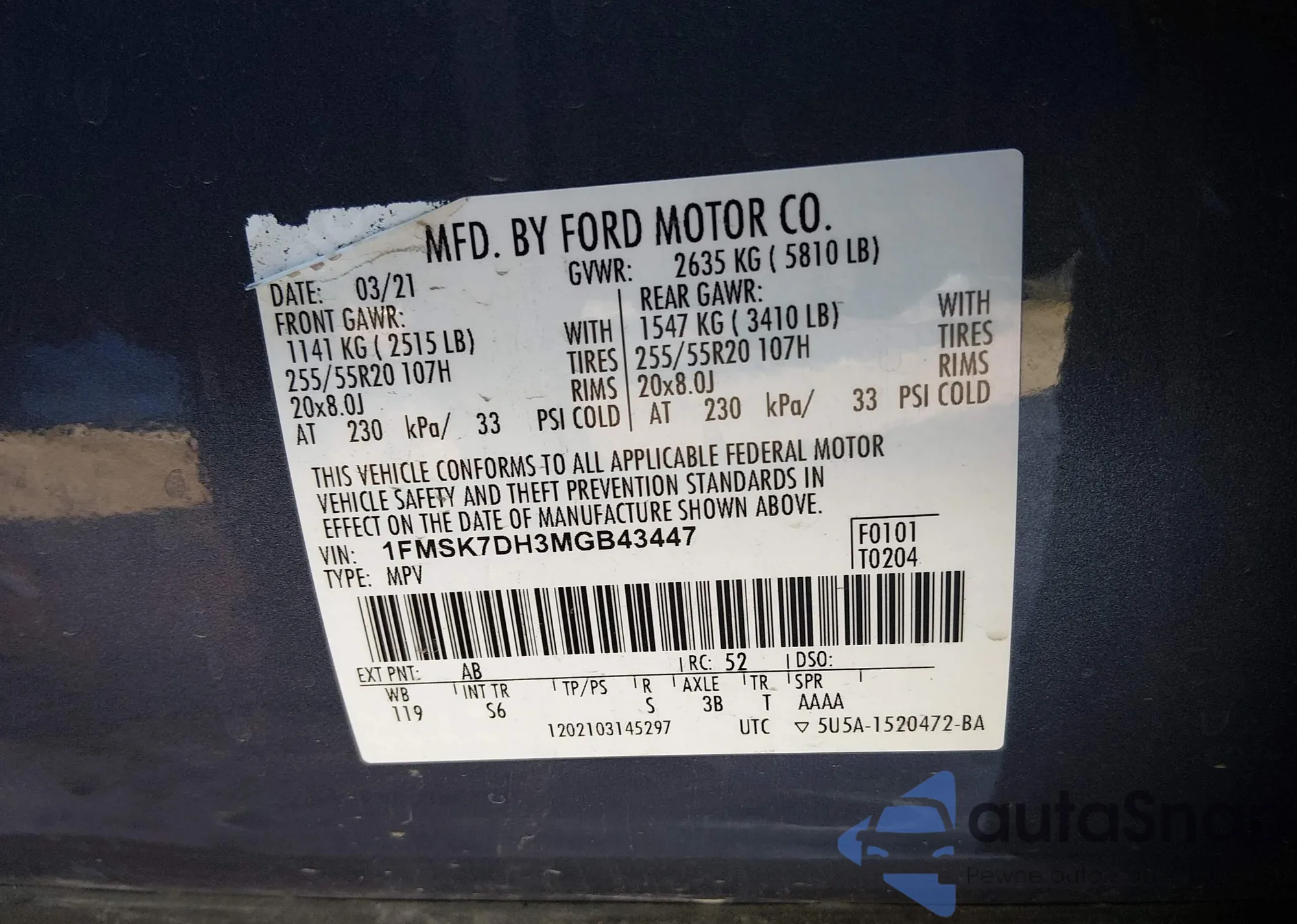 • VIN 1FMSK7DH3MGB43447